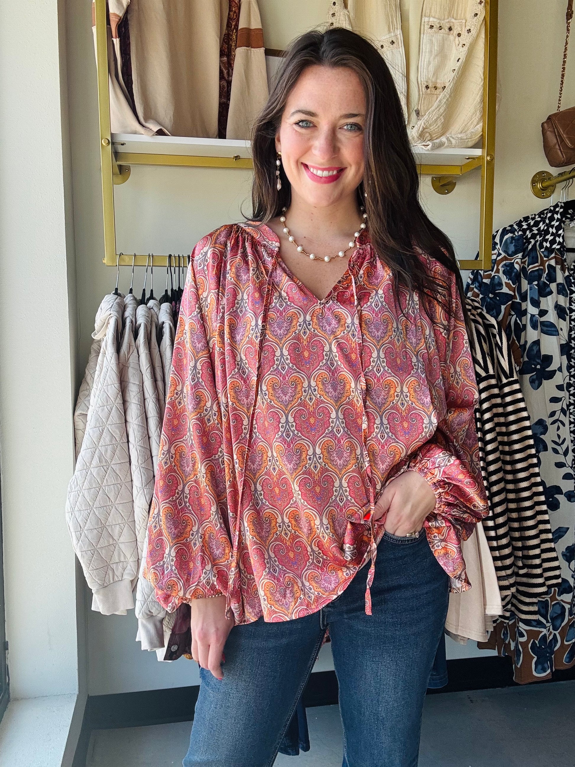 Add a splash of bold style with this silky blouse featuring playful balloon sleeves and vibrant ethnic prints. Its exaggerated sleeves create a fun, eye-catching silhouette while the smooth fabric feels luxurious against your skin. Perfect for turning everyday outfits into a celebration of color and movement.