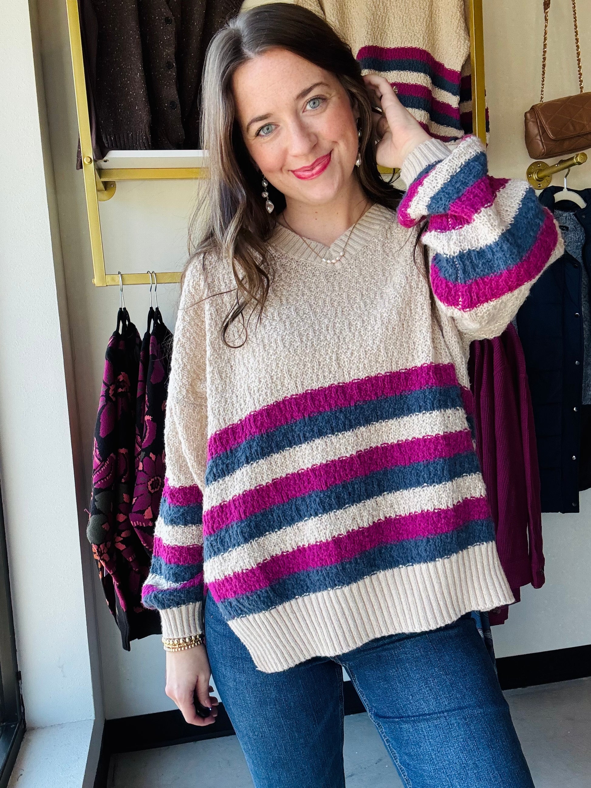 Stay warm and stylish in this cozy-cute striped sweater! Featuring a soft textured knit with bold magenta and navy stripes, this sweater is the perfect blend of comfort and charm. The relaxed fit and flattering V-neckline make it easy to dress up or down, while the longer length pairs perfectly with leggings or your favorite jeans. Effortlessly comfy, endlessly wearable — this will be your new go-to for cool-weather days.