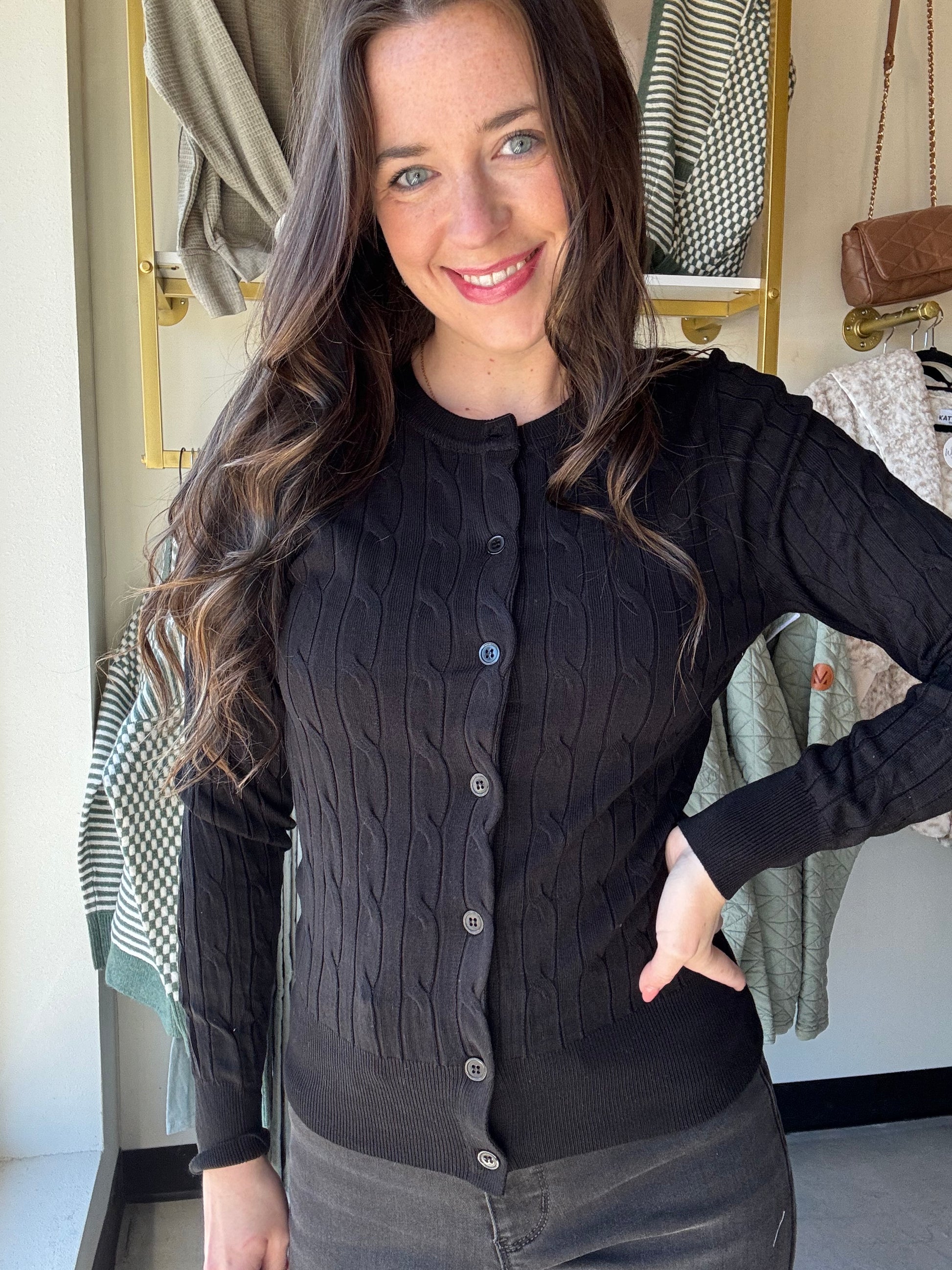 Elevate your style with the Black Button Up Cable Knit Cardigan, featuring shank buttons for a polished touch. Its smart, sturdy design keeps you cozy and chic, while ribbed cuffs, hem, and neck add texture and fit. Available in a range of rich tones, the cable-knit body brings a cozy twist that’s always in style. Perfect for layering or wearing solo, this cardigan adds a playful yet refined vibe to any outfit.