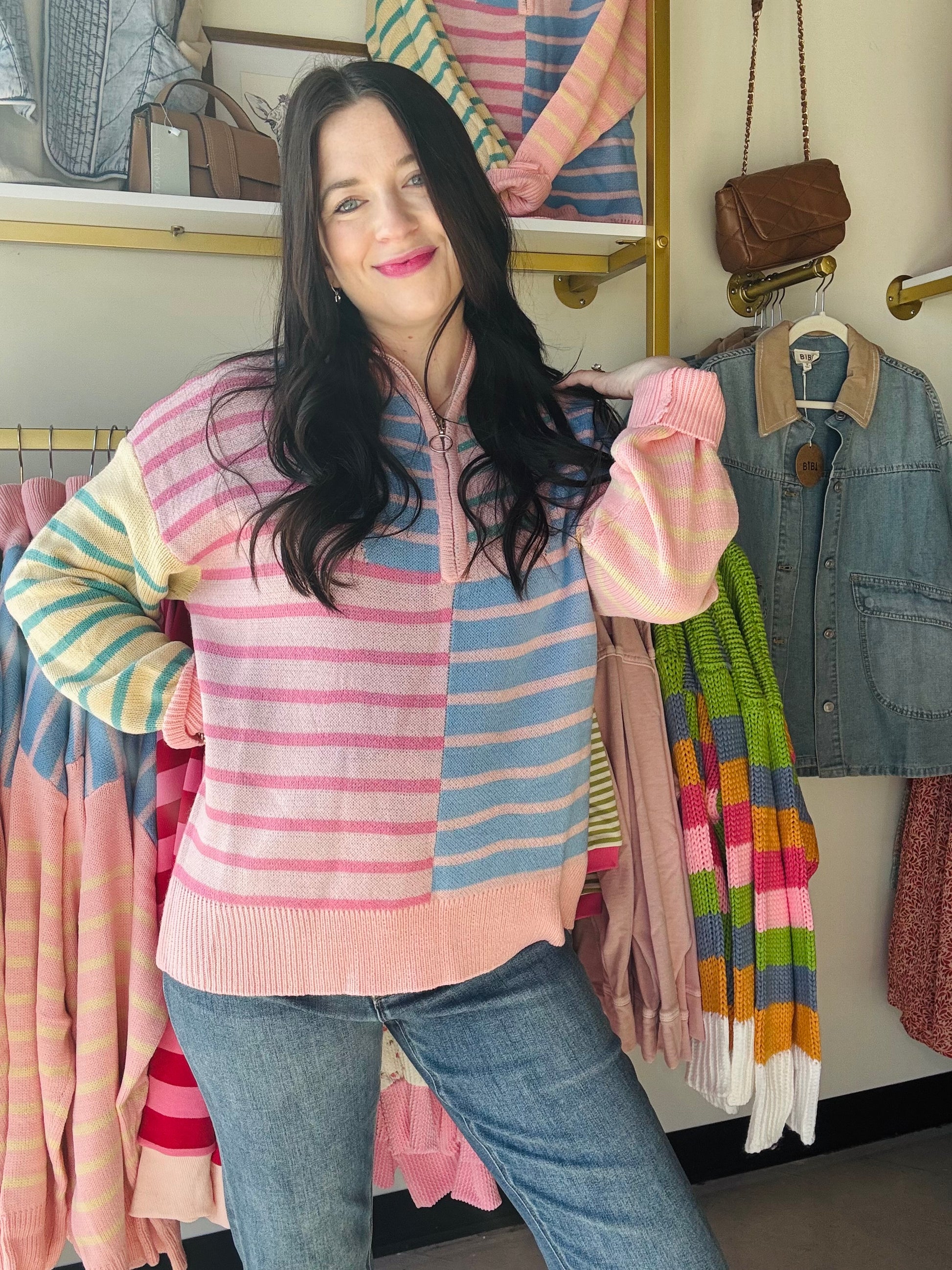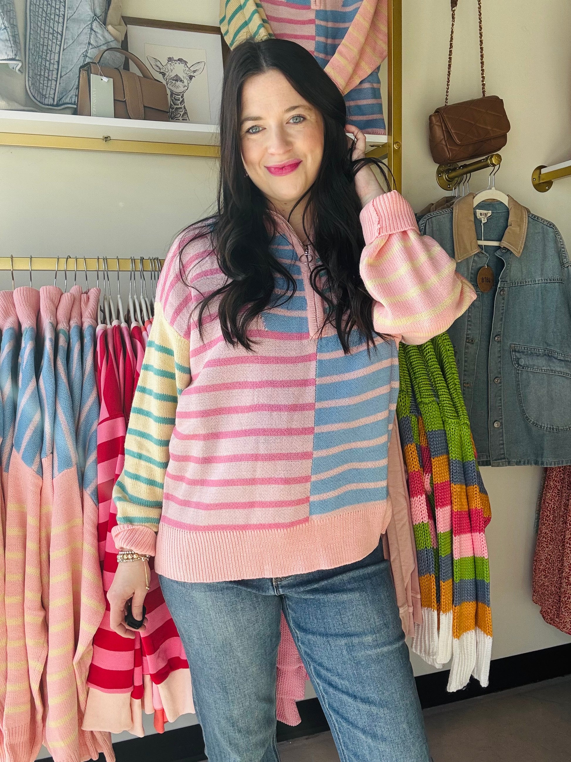 Elevate your casual wardrobe with this striking color block knit sweater. Featuring a high neckline and half-zip closure for easy layering, the long sleeves showcase bold horizontal stripes that add visual interest. The oversized, loose-fit silhouette offers comfort and modern style, perfect for pairing with jeans or leggings. Crafted from soft knit fabric, this versatile piece transitions seamlessly from weekend outings to relaxed workdays.