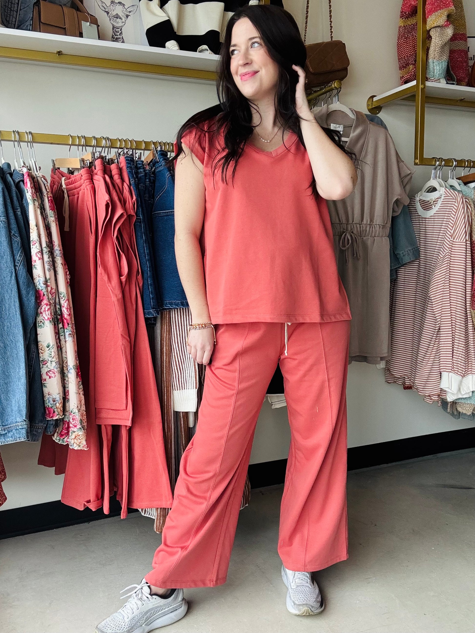 Comfort meets style with these brick-colored lounge bottoms, designed for relaxed days at home or casual outings. The elastic waistband with drawstring ensures a customizable fit, while functional side pockets add practical appeal. Perfect for lounging, running errands, or layering under oversized sweaters. The small size features a 27" inseam for a flattering length. Soft, breathable fabric keeps you cozy without sacrificing ease of movement.