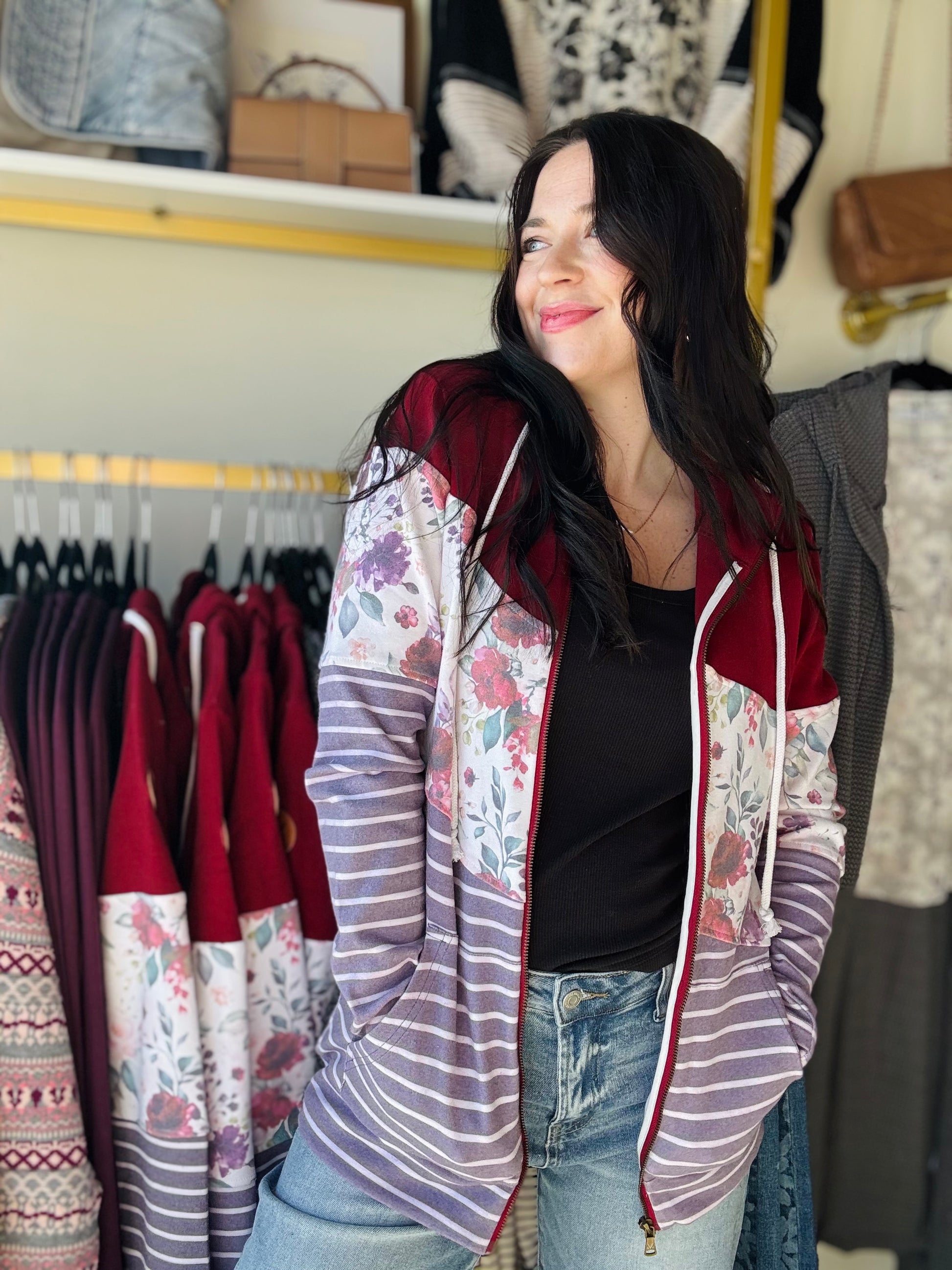 Be bold and make a statement this spring with our Colorblock Fullzip Hoodie! Featuring a trendy colorblock design with burgundy, burgundy bloom, and plum stripes! This hoodie is perfect for the risk-taker who loves to stand out. Made with stretchy fabric for ultimate comfort, this hoodie will keep you looking stylish and feeling confident all season long.