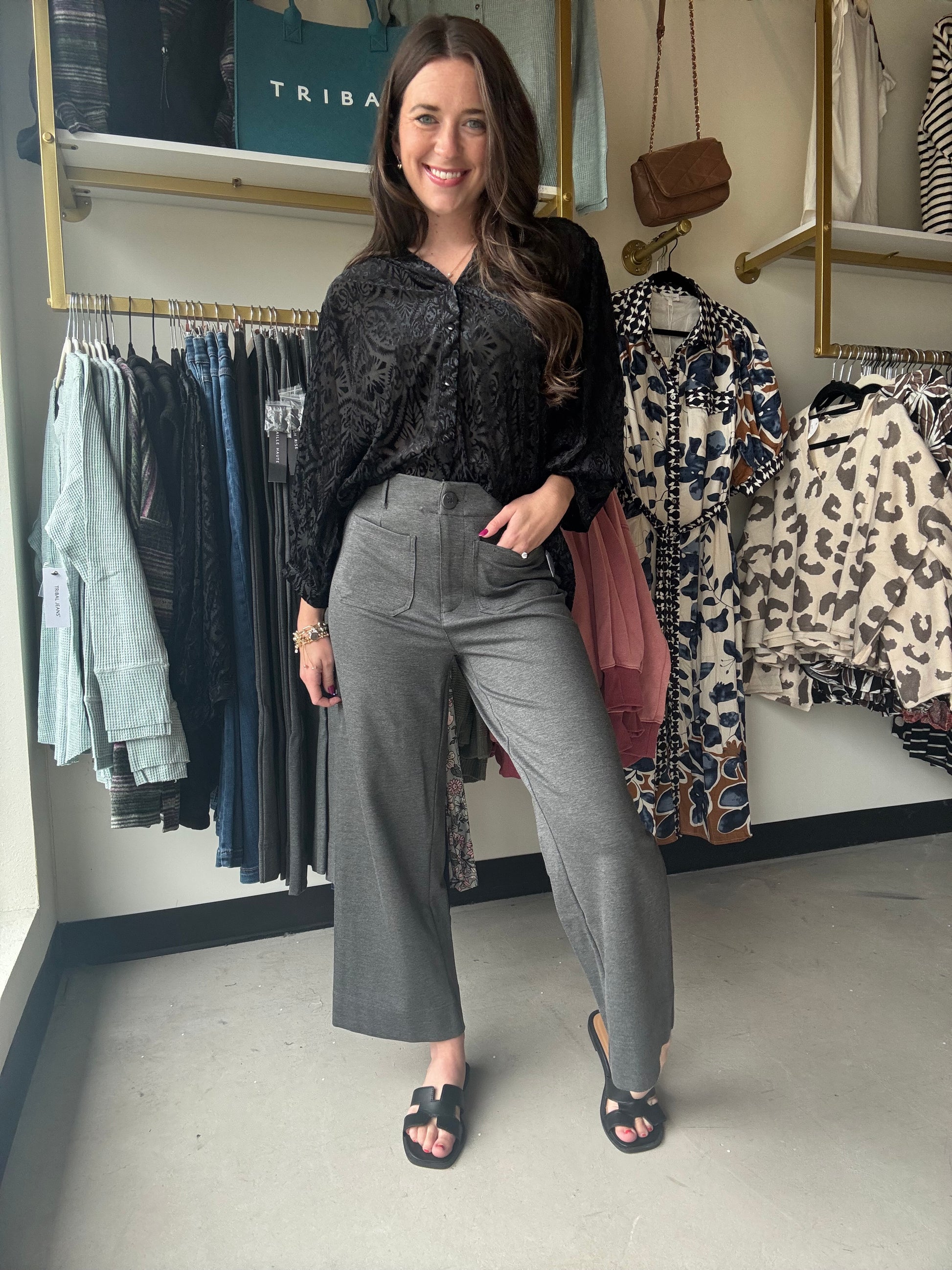 Effortlessly move through your day in style with our Charcoal High Rise Capris. These versatile pants feature a flattering high-rise fit and relaxed wide legs for ease and comfort. The classic fly and marbled button add timeless charm, and the stretch ponte fabric ensures all-day comfort with a polished finish.