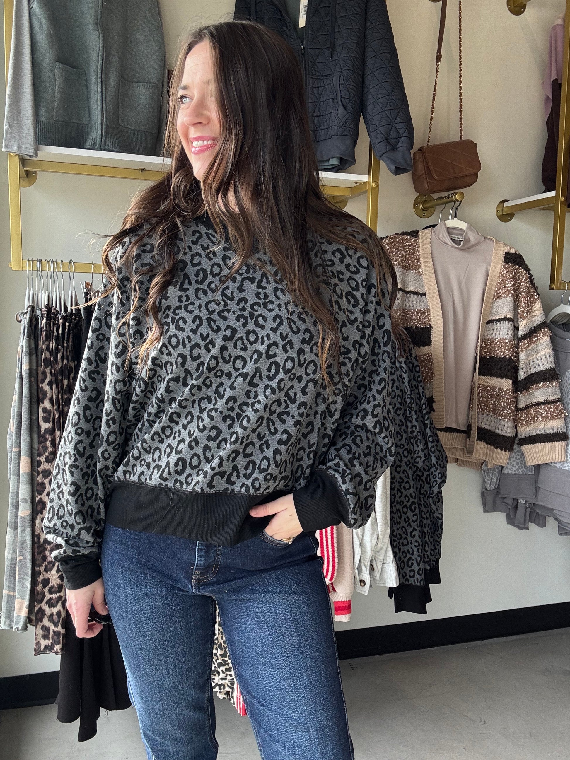 This Charcoal Leopard Crewneck Sweatshirt combines refined design with effortless comfort. Crafted from high-quality fabric, its charcoal base is complemented by a subtle black leopard pattern. Pair this pullover with your favorite denim or joggers for a casual look.