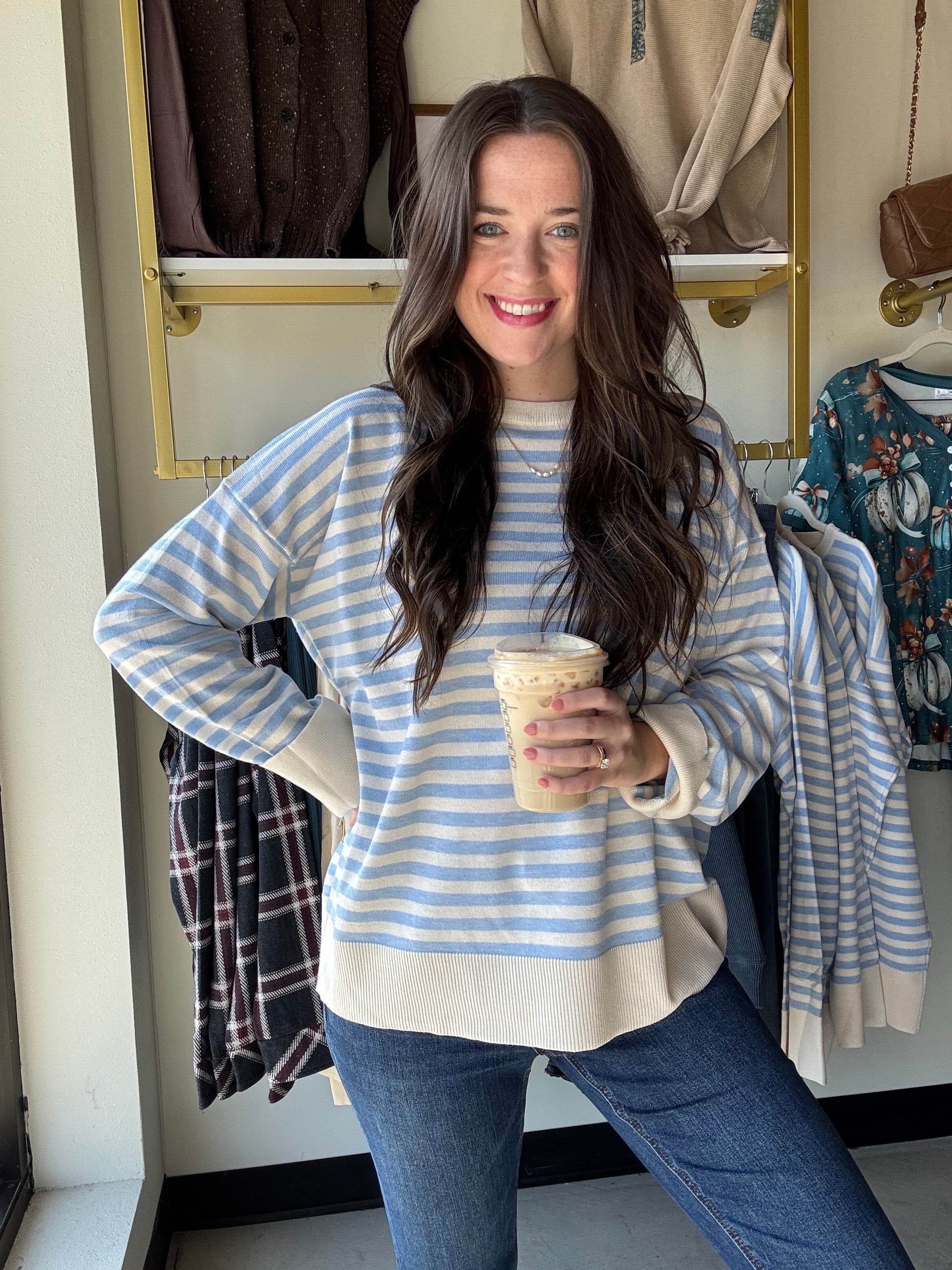 Stay cozy in the Cloud Ivory Stripe Sweater, featuring a playful crewneck and airy wide sleeves that add just the right touch of flair. Its lightweight knit keeps things breezy and comfortable, perfect for layering on cooler days. Enjoy a fun twist on a classic striped look!