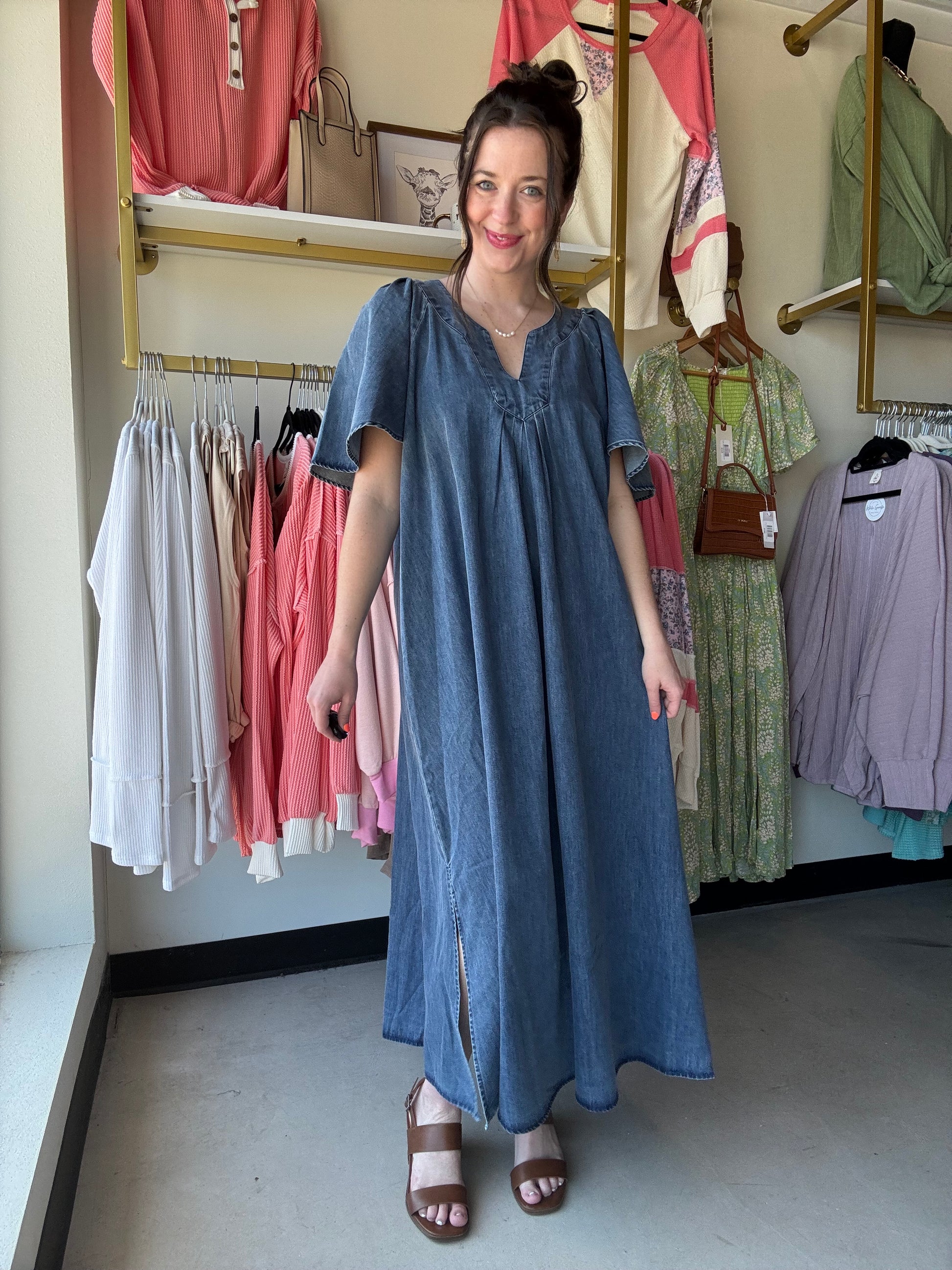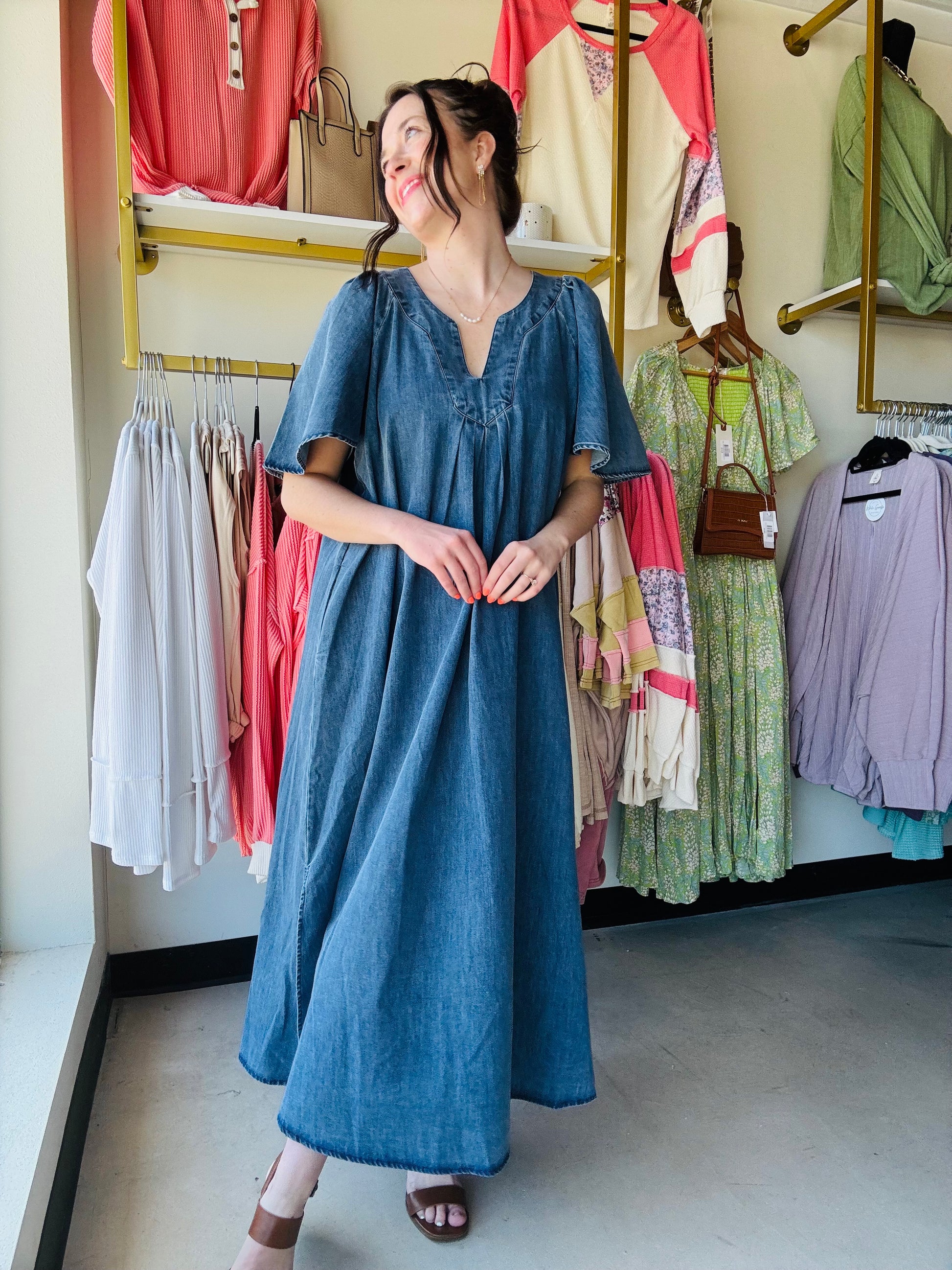 This Dark Denim Wing Sleeve Dress features wing sleeves, a V-neck, and a washed denim maxi dress design. These elements create a comfortable, stylish piece that can be dressed up or down for any occasion. Made from high-quality denim, it is durable and versatile.