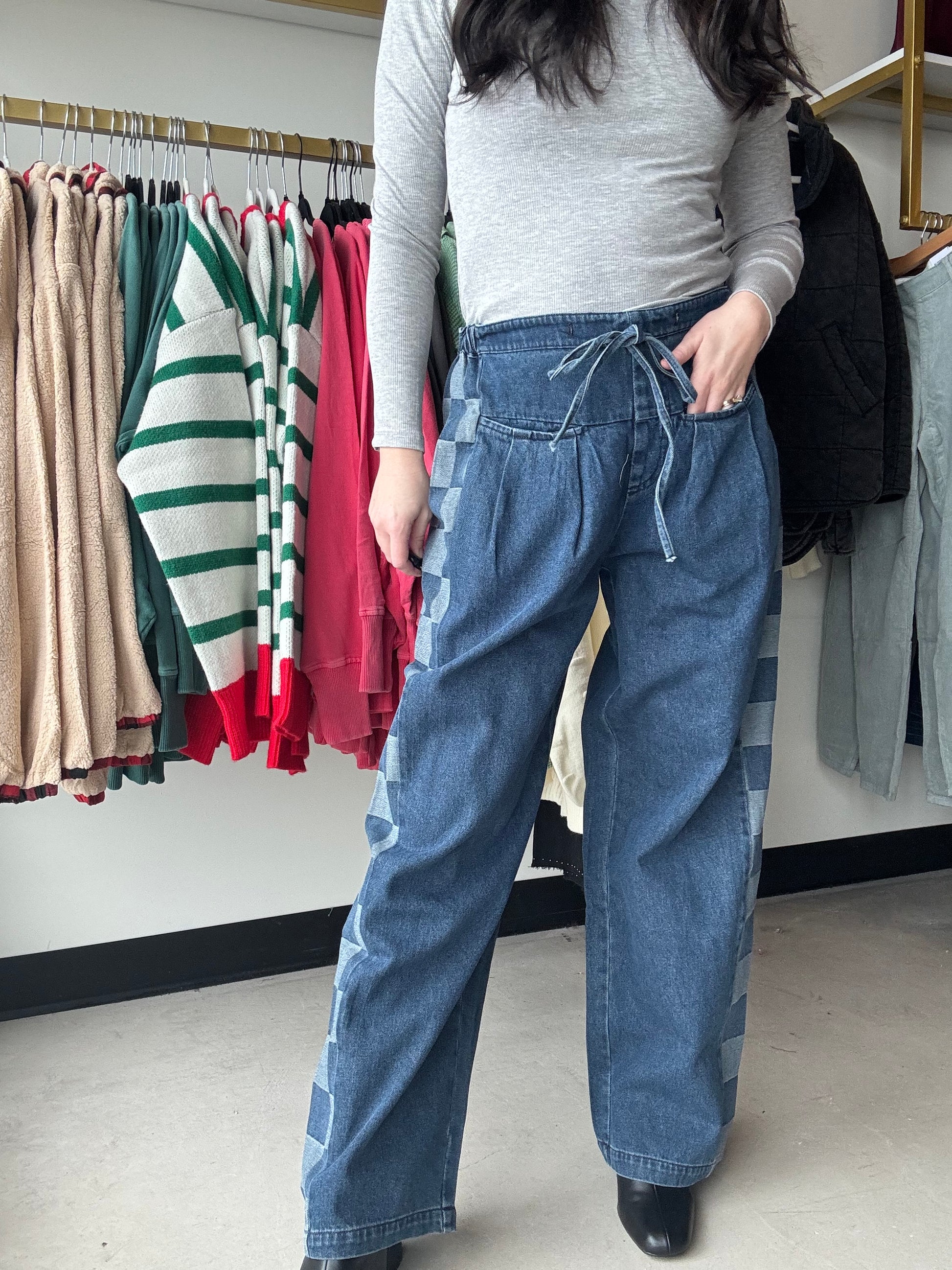 These versatile denim pants blend classic style with modern comfort. Featuring a stretchy elastic waistband for all-day ease and a flattering wide-leg silhouette, they're designed to work with your favorite fitted tops. The checkered side panels add visual interest and dimension to an otherwise timeless piece. Perfect for creating effortless, balanced outfits that feel both put-together and comfortable.