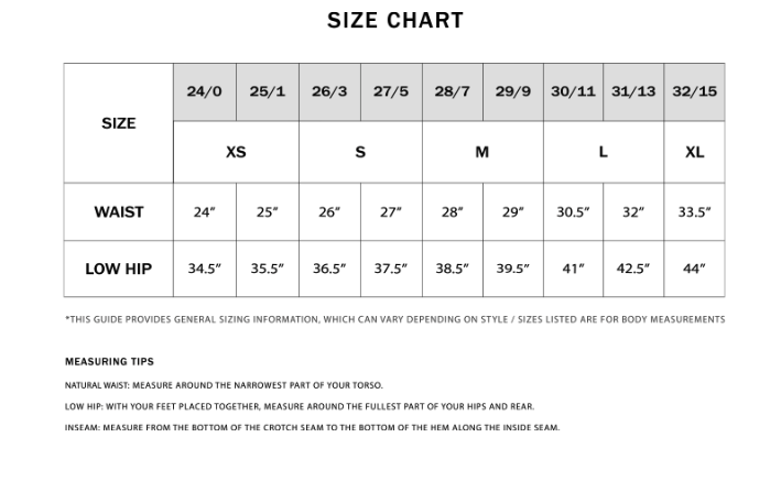 RISE: 10 1/2" / INSEAM: 27" / LEG OPENING: 18"