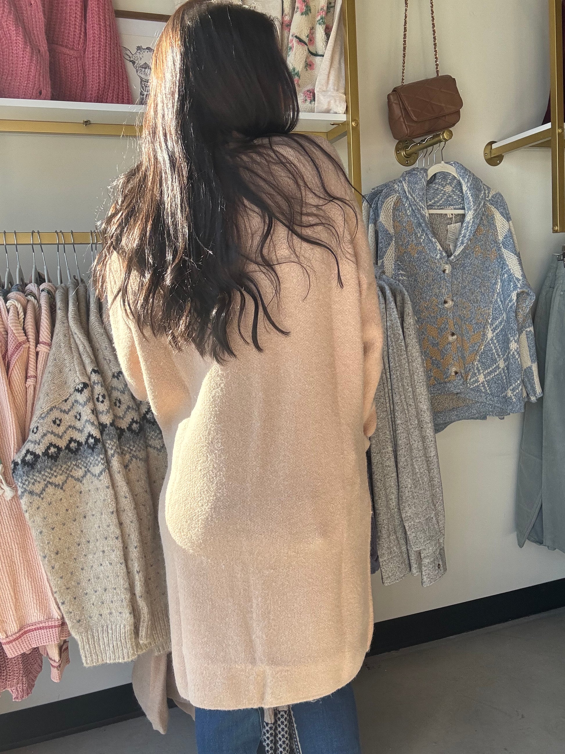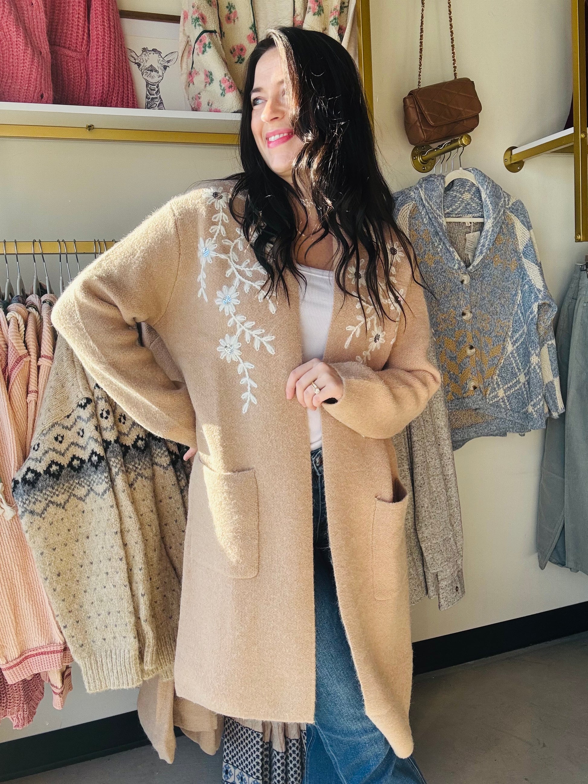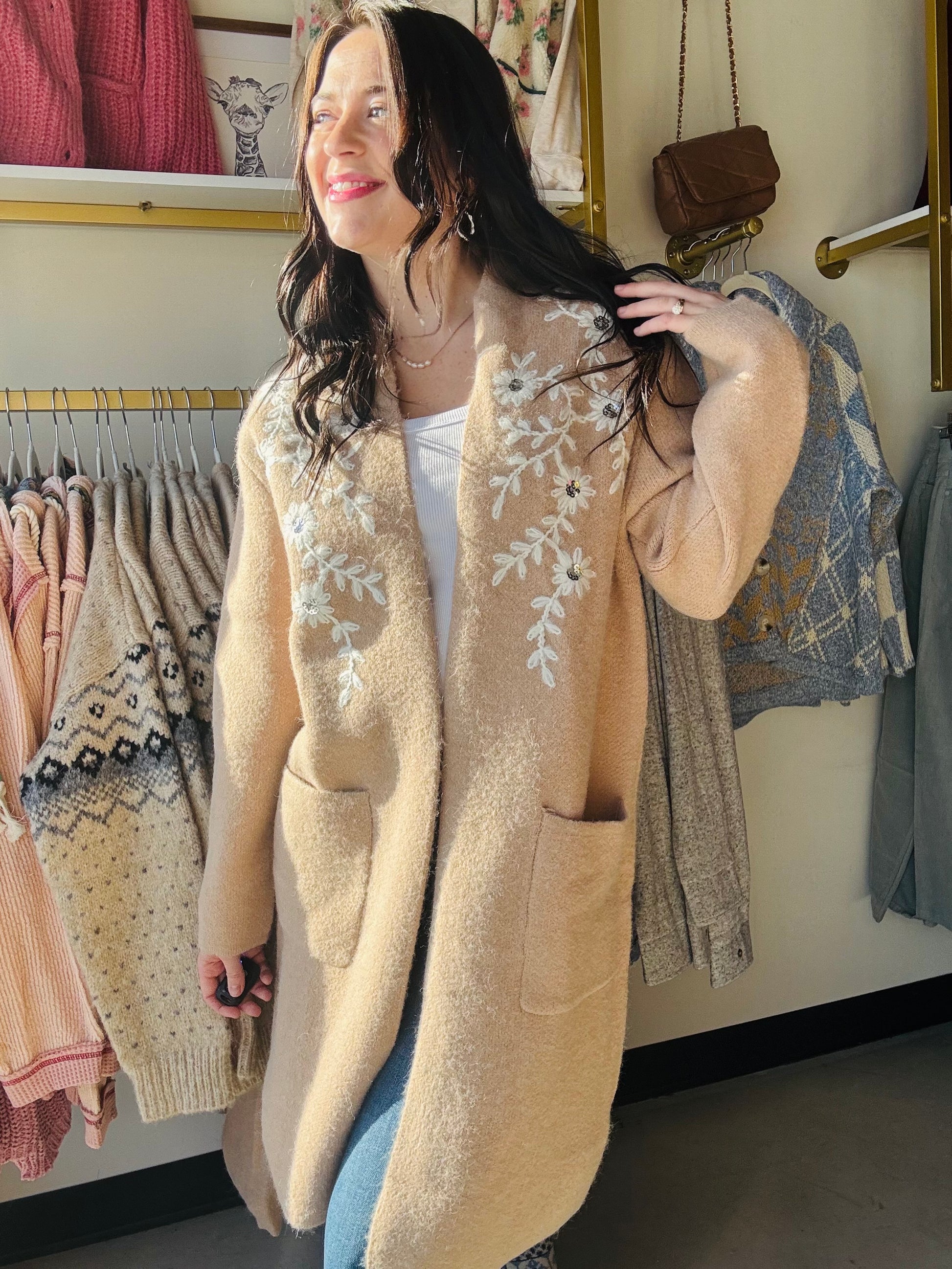 This stunning coatigan features delicate floral embellishments that add a touch of elegance to your everyday wardrobe. Cut in a flattering duster length, it layers beautifully over dresses, jeans, or casual outfits. Practical front pockets keep your essentials within reach while you enjoy the effortless sophistication this piece brings to any look.