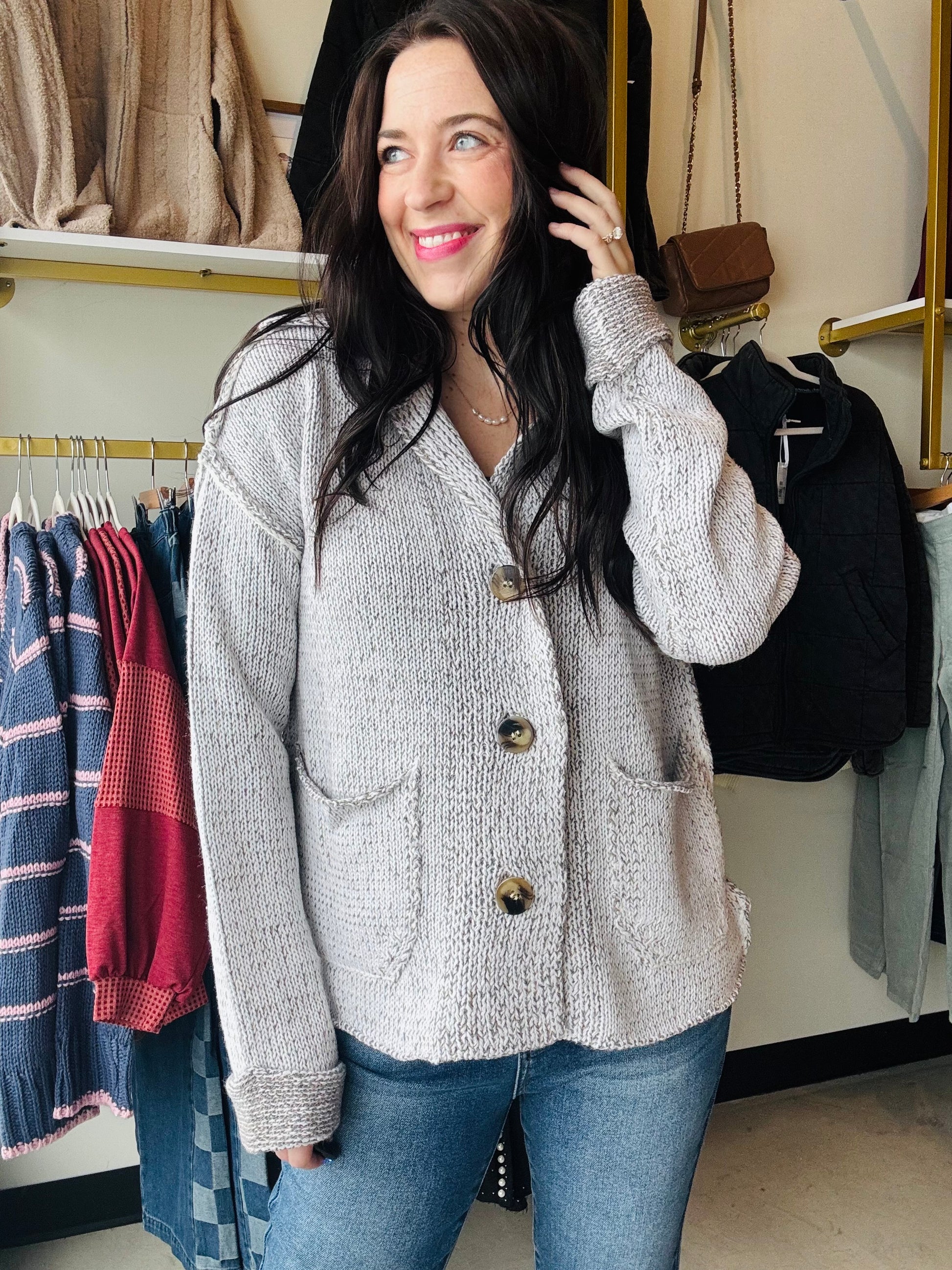 This versatile cardigan features distinctive reverse seam detailing that adds modern visual interest to a classic silhouette. Crafted from a breathable blend of acrylic, cotton, and polyester, it offers comfort and durability for everyday wear. Practical front pockets make it functional for casual styling, while the heather grey tone pairs effortlessly with any wardrobe. Perfect for layering over tees or dresses, this piece transitions seamlessly from season to season.