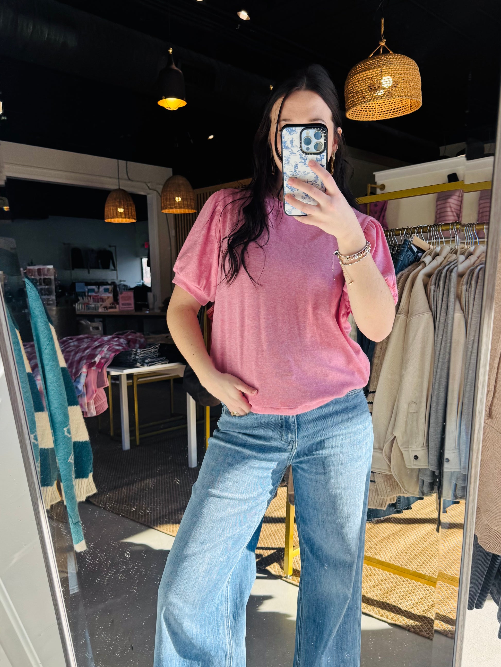Stay cozy and stylish with the Katie Cozy Top in heathered pink. The feminine sleeves and rounded neckline add a touch of elegance, while the soft fabric keeps you comfortable. Perfect for a spring look, this cute top pairs perfectly with boots and jeans.