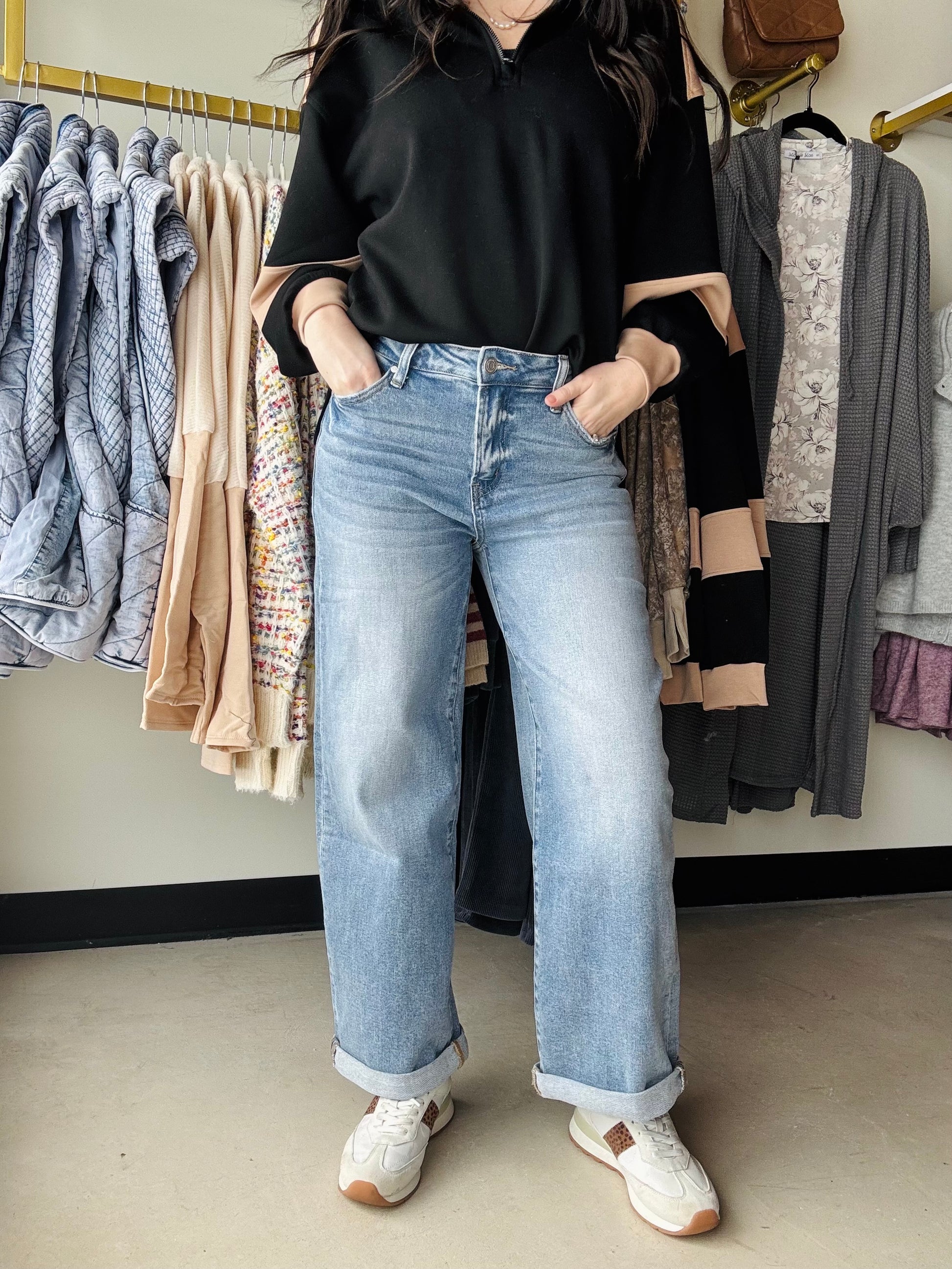 - STRETCHED DENIM - HIGH-RISE - WIDE LEG - DOUBLE ROLL-UP HEMLINE - CUFFED - CROPPED LENGTH (INSEAM 28")
