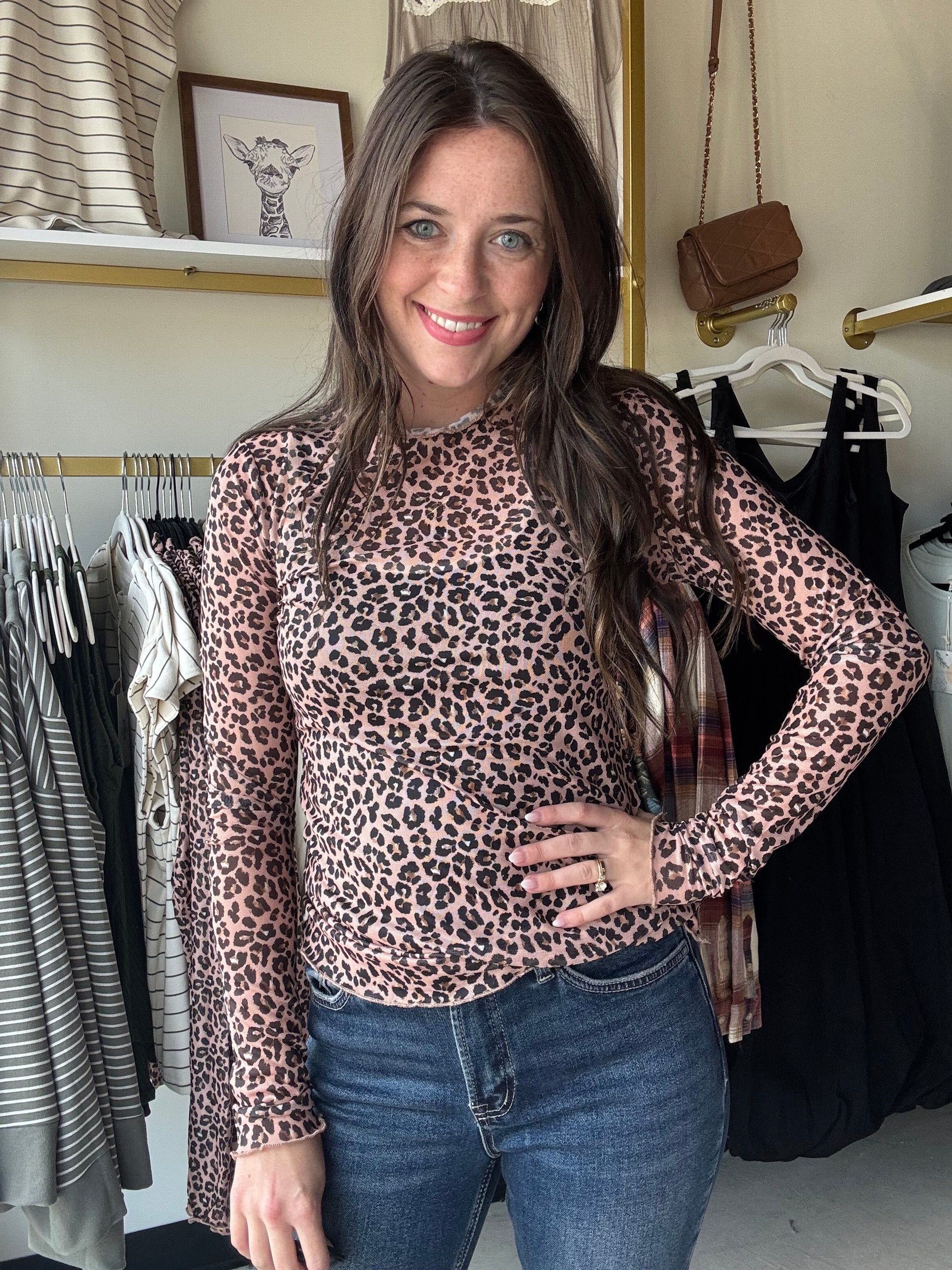 Get trendy with the Keagan Mesh Top in a fun leopard print! This playful top features lettuce hems, a mock neckline, and a sheer mesh material that can be layered under or over any outfit. Don't miss out on this must have piece!