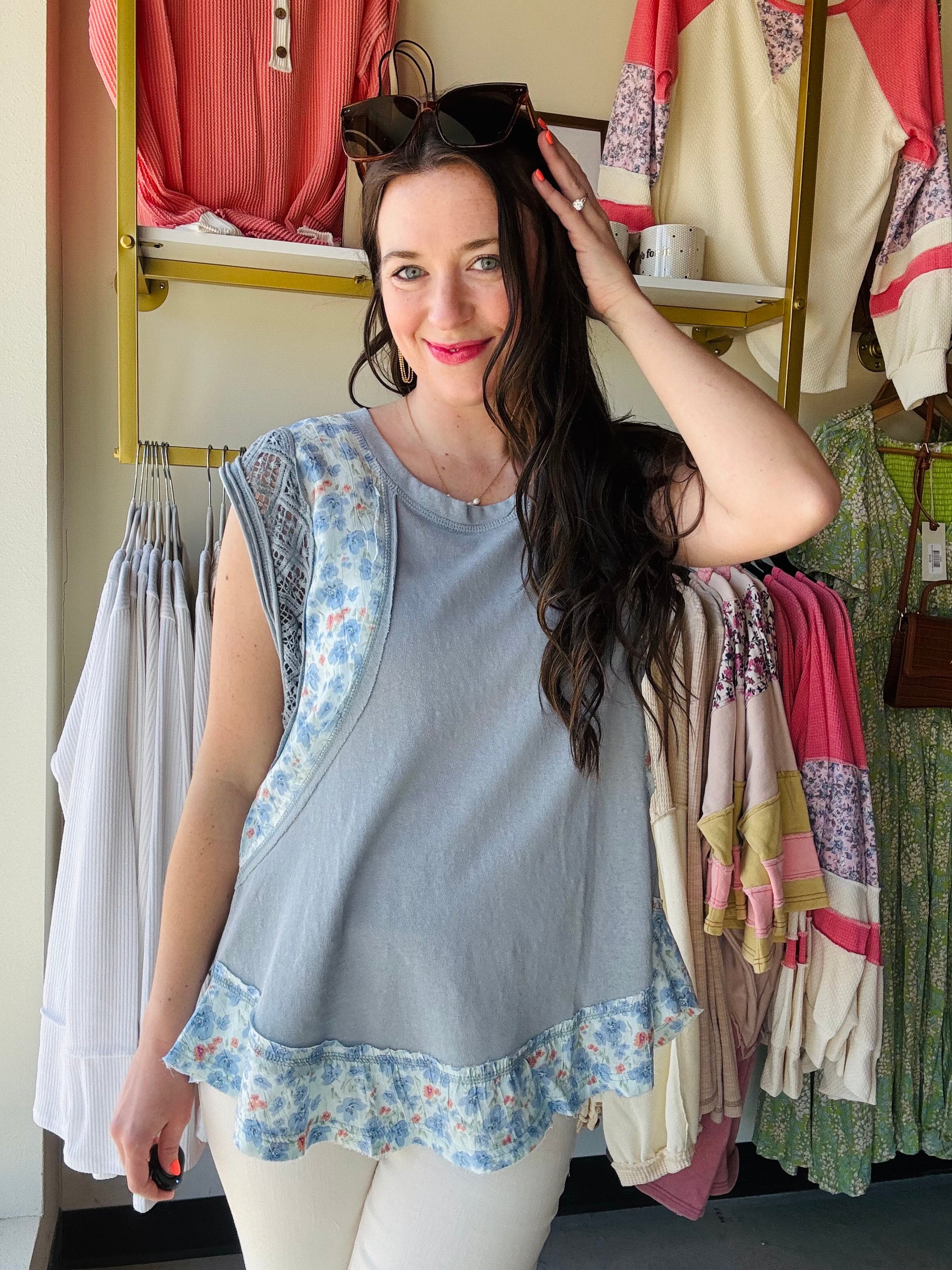 Get ready to bloom in style with our Lace Trim Pointed Floral Top! This relaxed fit top is crafted from soft cotton jersey, designed with a playful round neck and sleeveless cut. The lace trim detail adds a touch of feminine charm to the pointed floral pattern. Perfect for adding a fun and flirty touch to any outfit.