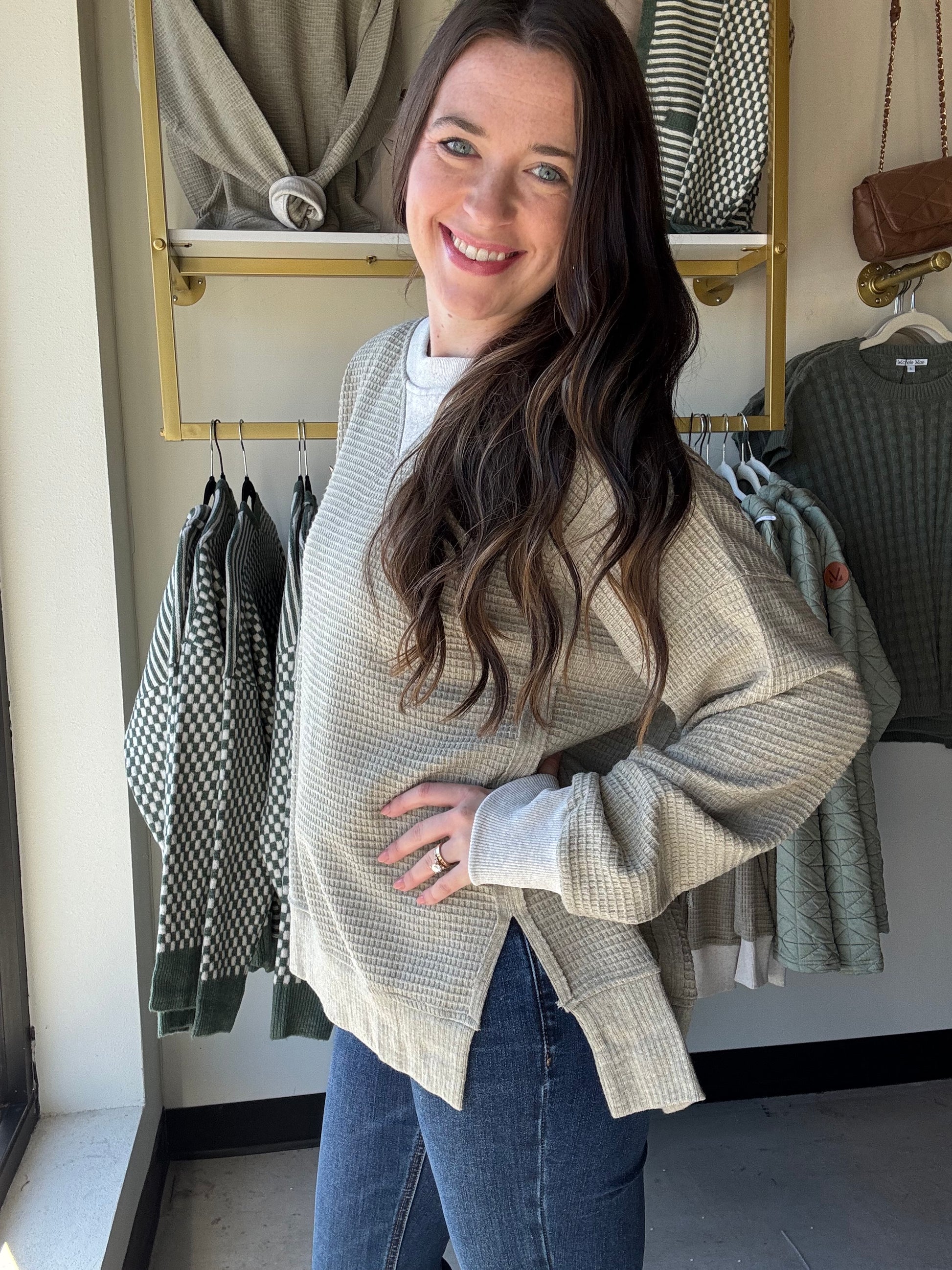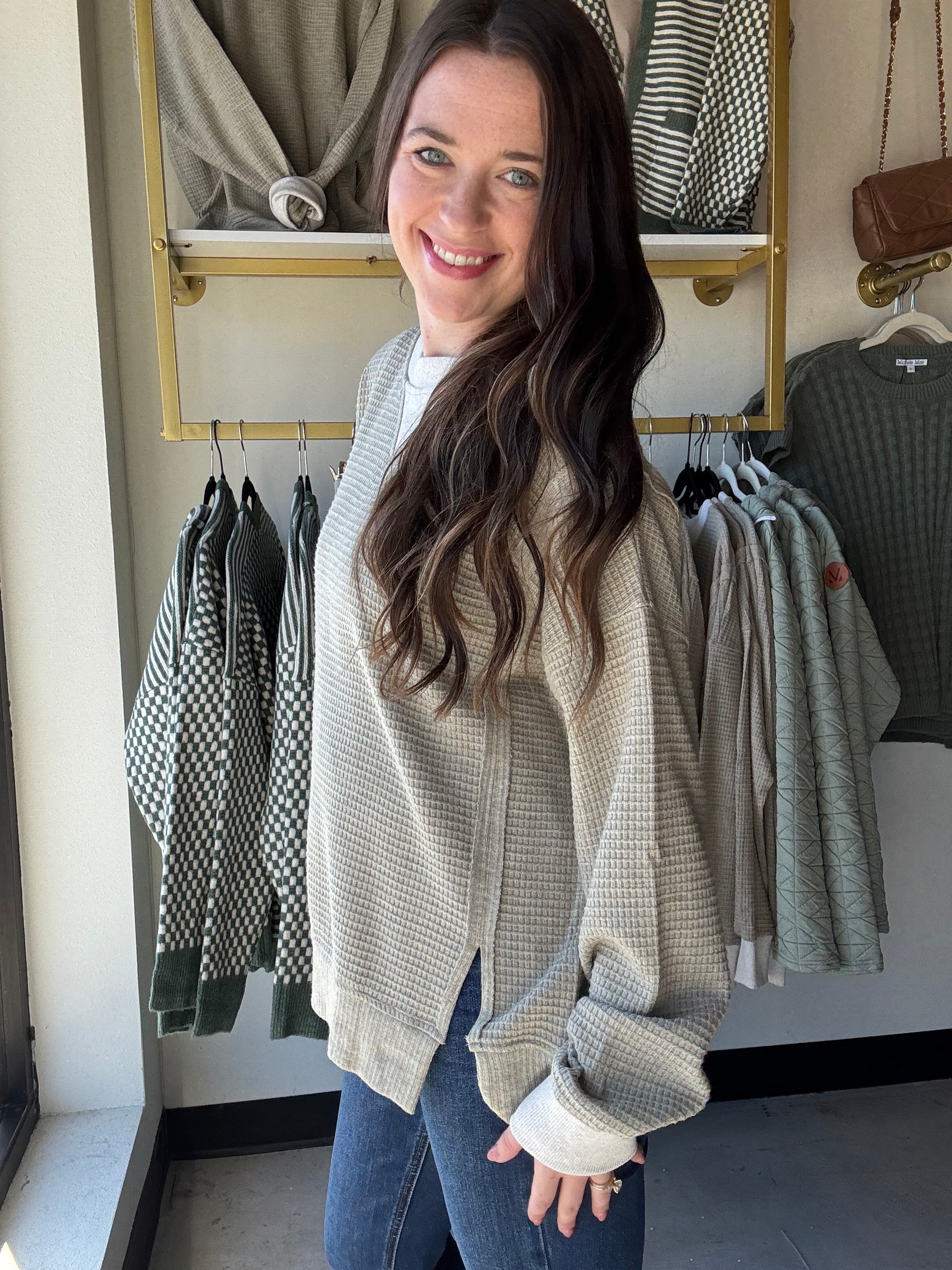Cozy meets cool in this Light Olive Brushed Thermal oversized pullover. Featuring a soft brushed texture and playful slit details, it’s perfect for lounging or layering on chilly days. The exposed hem adds a cheeky touch to an already comfy crew neck design—your new go-to for effortless style and warmth!