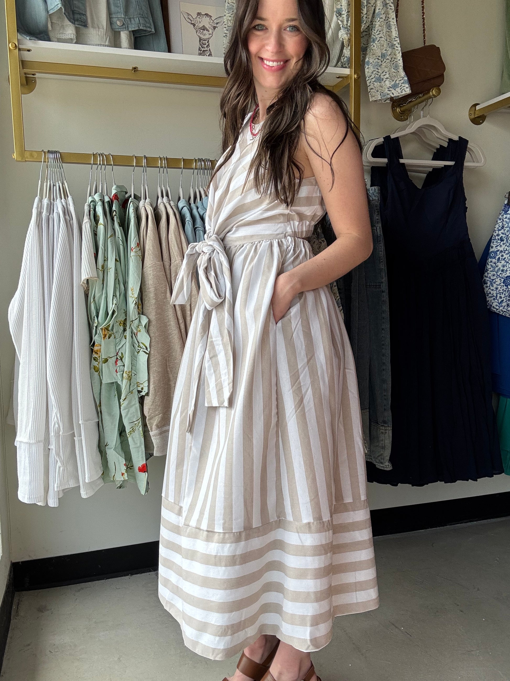 Elevate your wardrobe with our Natural Stripe Midi Dress. Showcasing a stunning cross front detail and an elegant open key hole back, this dress is designed to make a statement. With a tie back for the perfect fit, you'll feel confident and stylish in this must-have dress.
