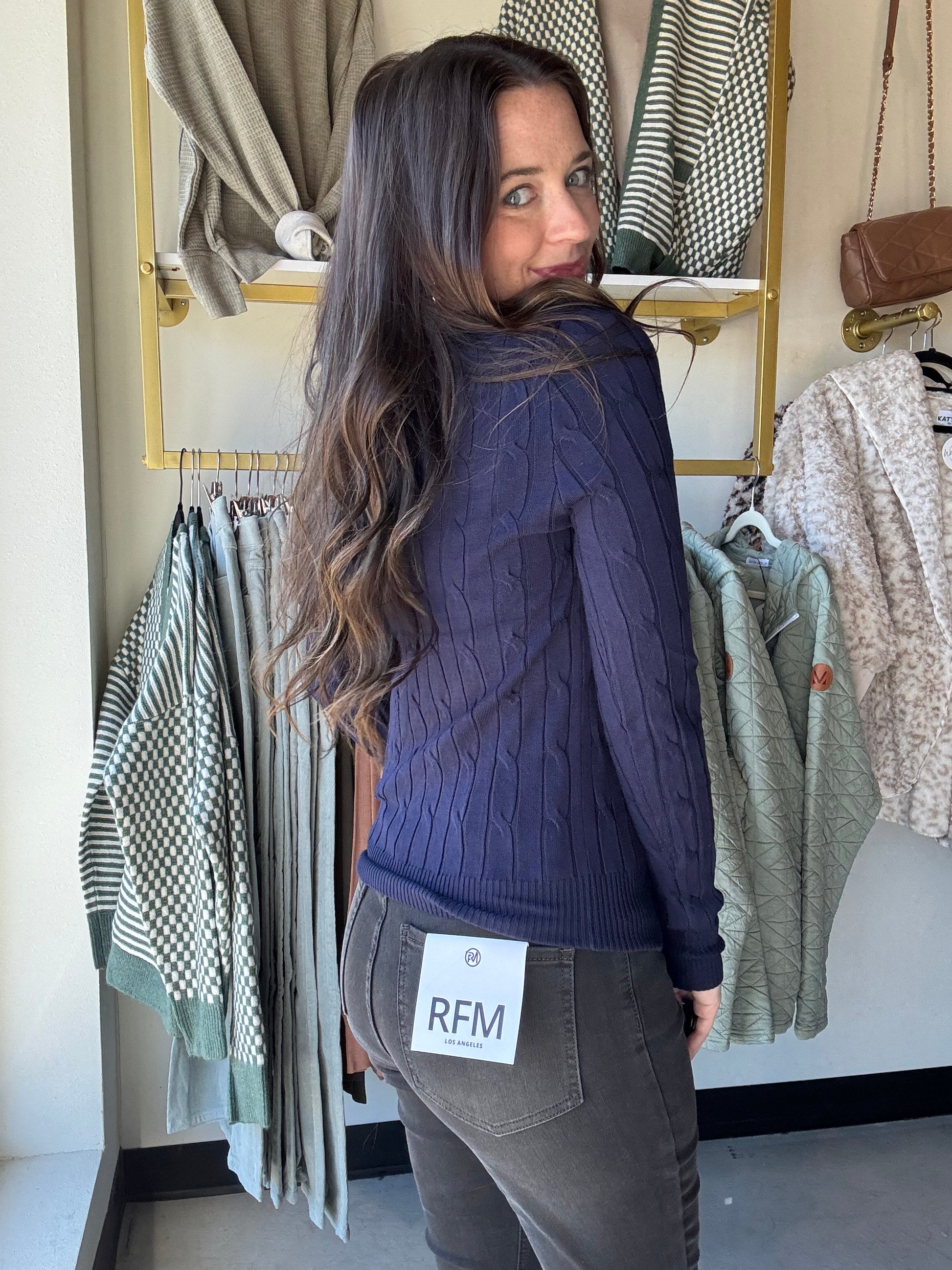 Stay cozy and stylish in this Navy Cable Knit Crewneck! Featuring ribbed crewneck, cuffs, and hem with a charming cable design, it hugs you just right without sacrificing comfort. Perfect for school, work, or layering on cooler days, its open vertical weaving paired with a classic twisted front makes every outfit pop. Embrace warmth with a twist of fun!