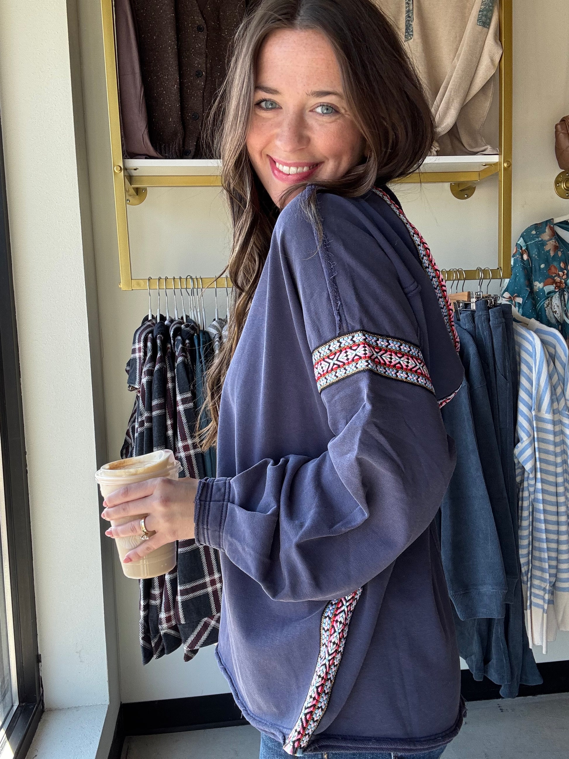 Embrace cozy vibes with this Navy Embroidered Trim Hoodie. Its relaxed, oversized fit and dropped shoulders ensure endless comfort, while the multicolor ethnic trim adds a fun pop of color. The attached hood tops off this laid-back look, perfect for playful days and chilly nights.