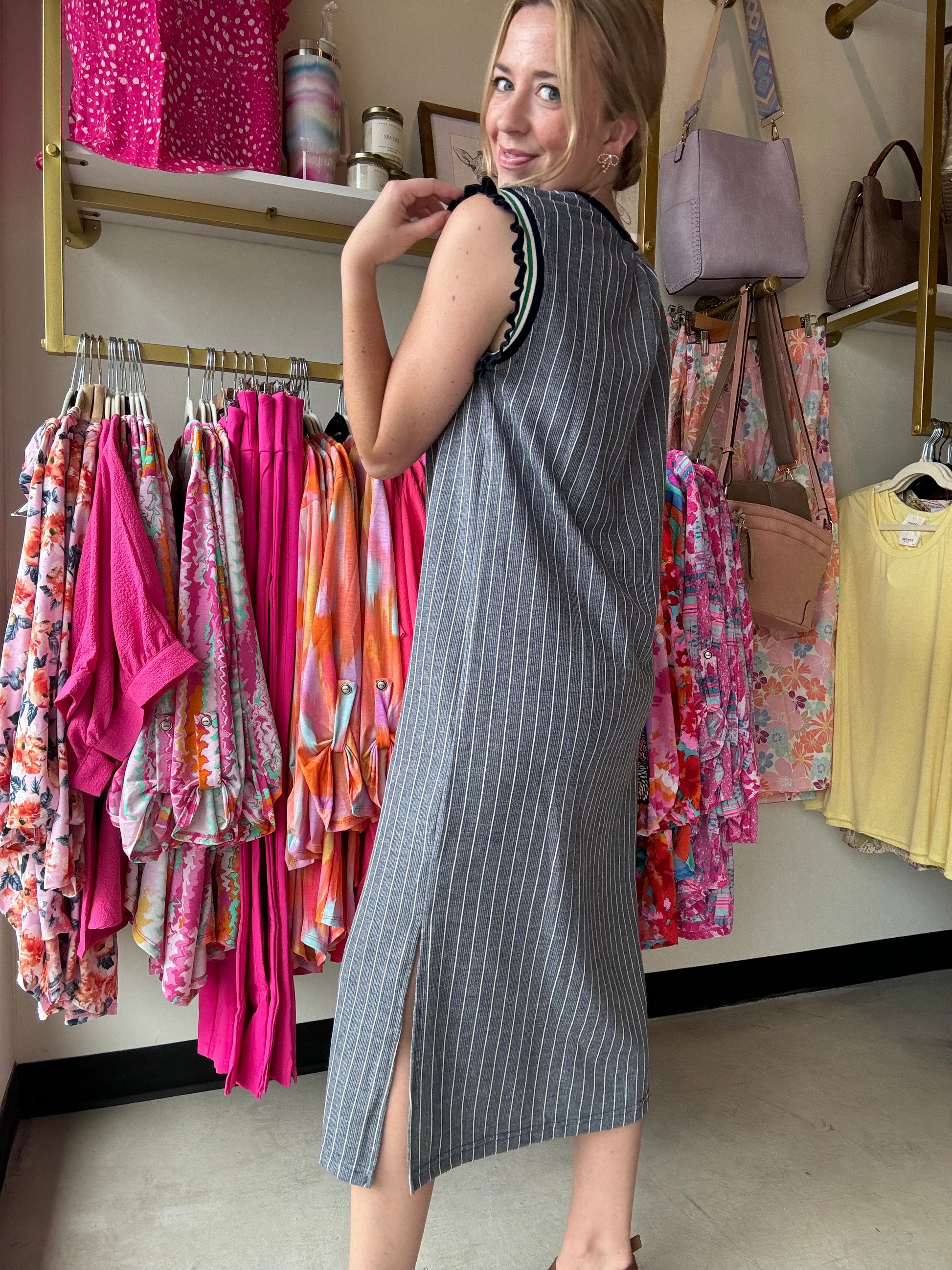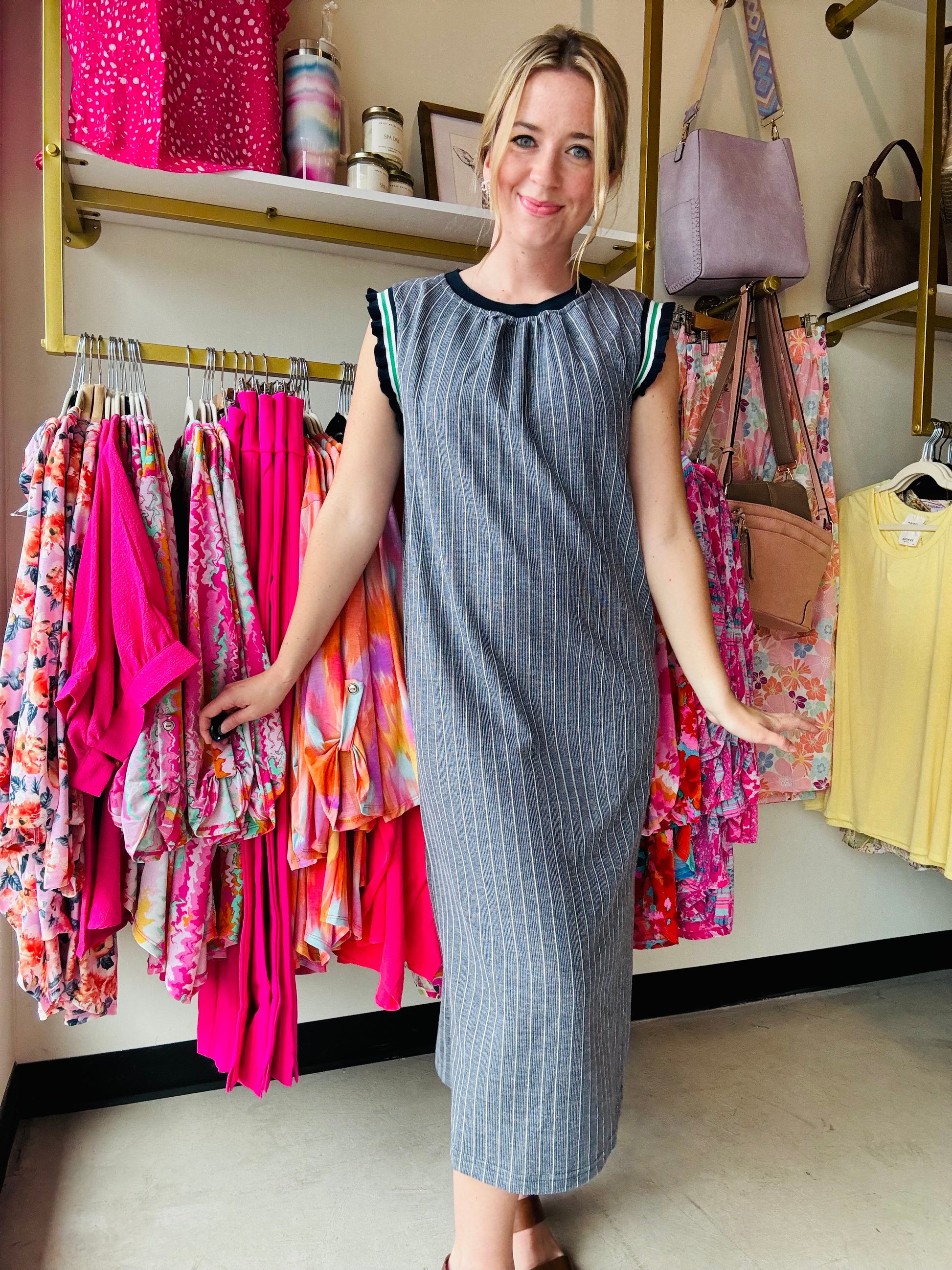 Get ready to rock the stripes in our Rib Band Detailed Midi Dress! Made from a cozy striped knit fabric, this dress features a round neckline and fun rib band details on the neck and sleeves. The side slit details add an extra touch of playful style. Perfect for a casual day out or dressed up for a night on the town.