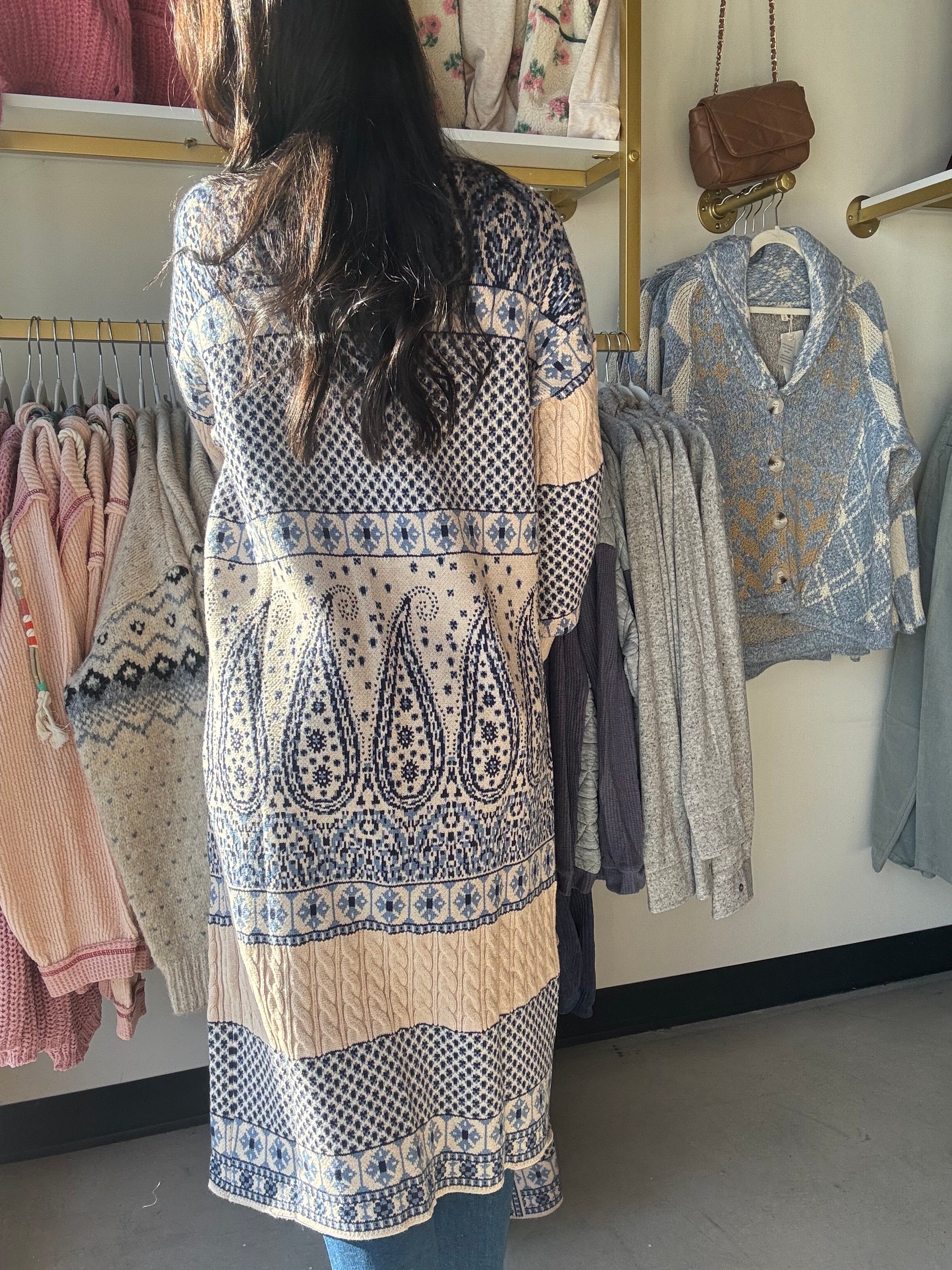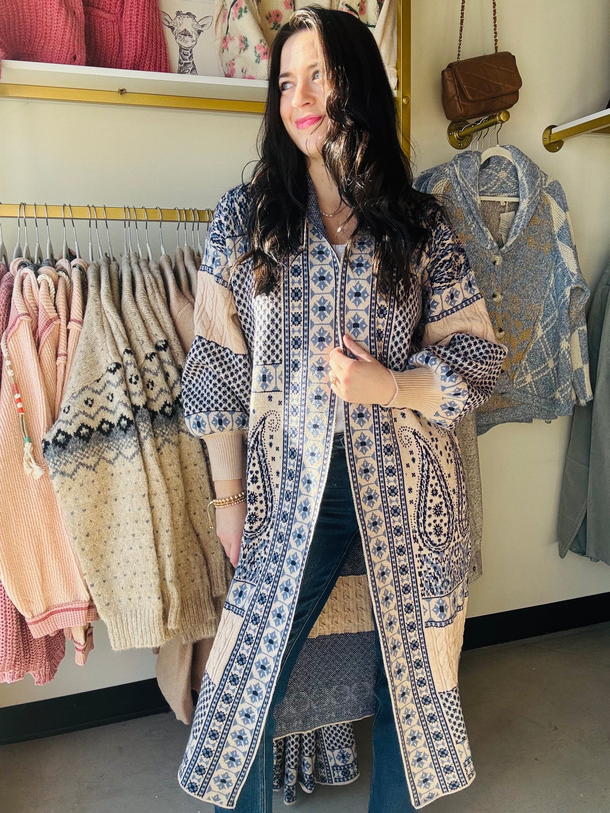 This stunning duster-length coatigan blends cable knit textures with an intricate paisley motif for effortless layering. The mixed-texture construction creates visual depth and dimension, while the elongated silhouette works beautifully over dresses, jeans, or leggings. Perfect for adding a sophisticated, artistic touch to any outfit, this sweater coat transitions seamlessly from season to season.