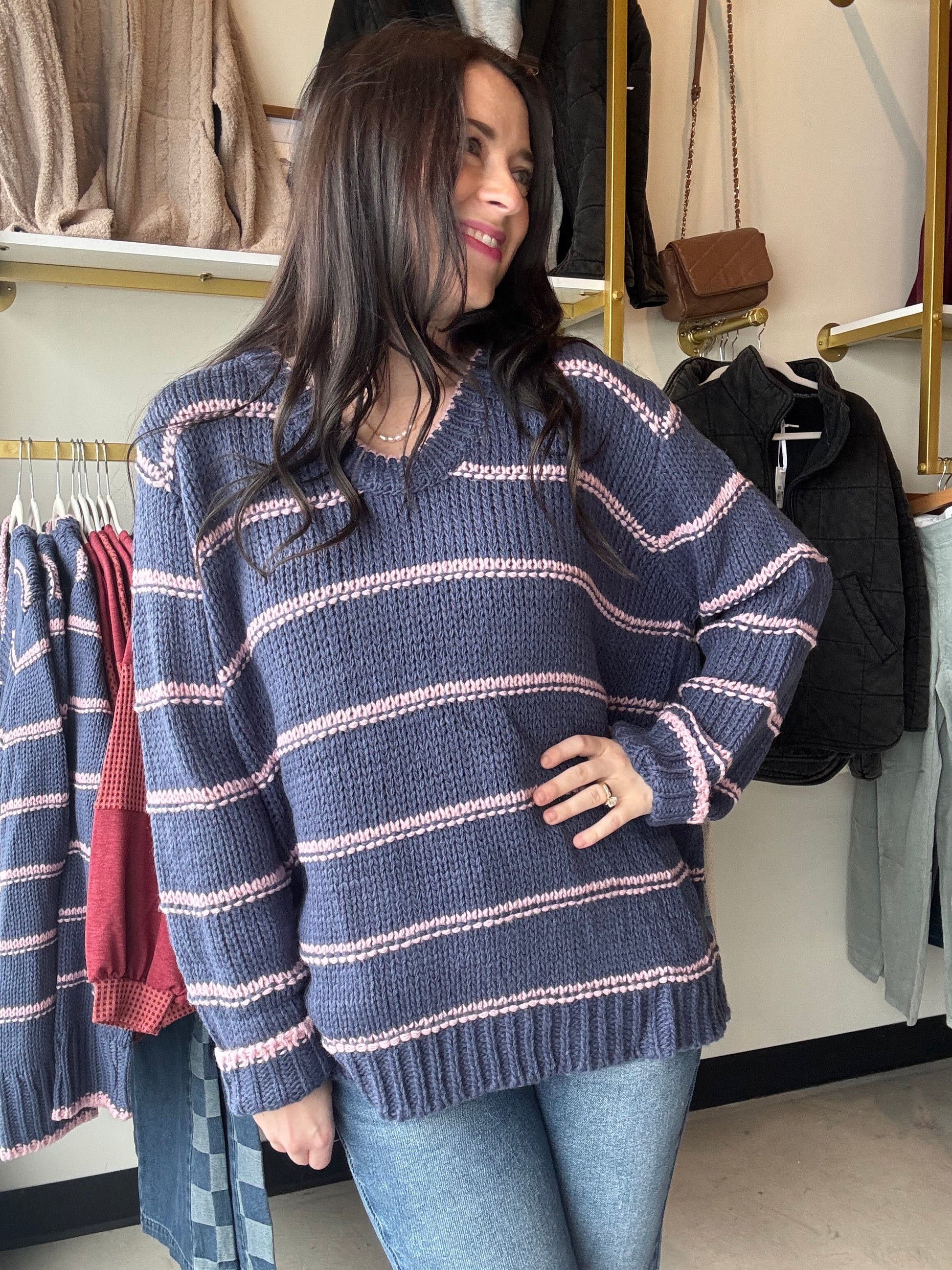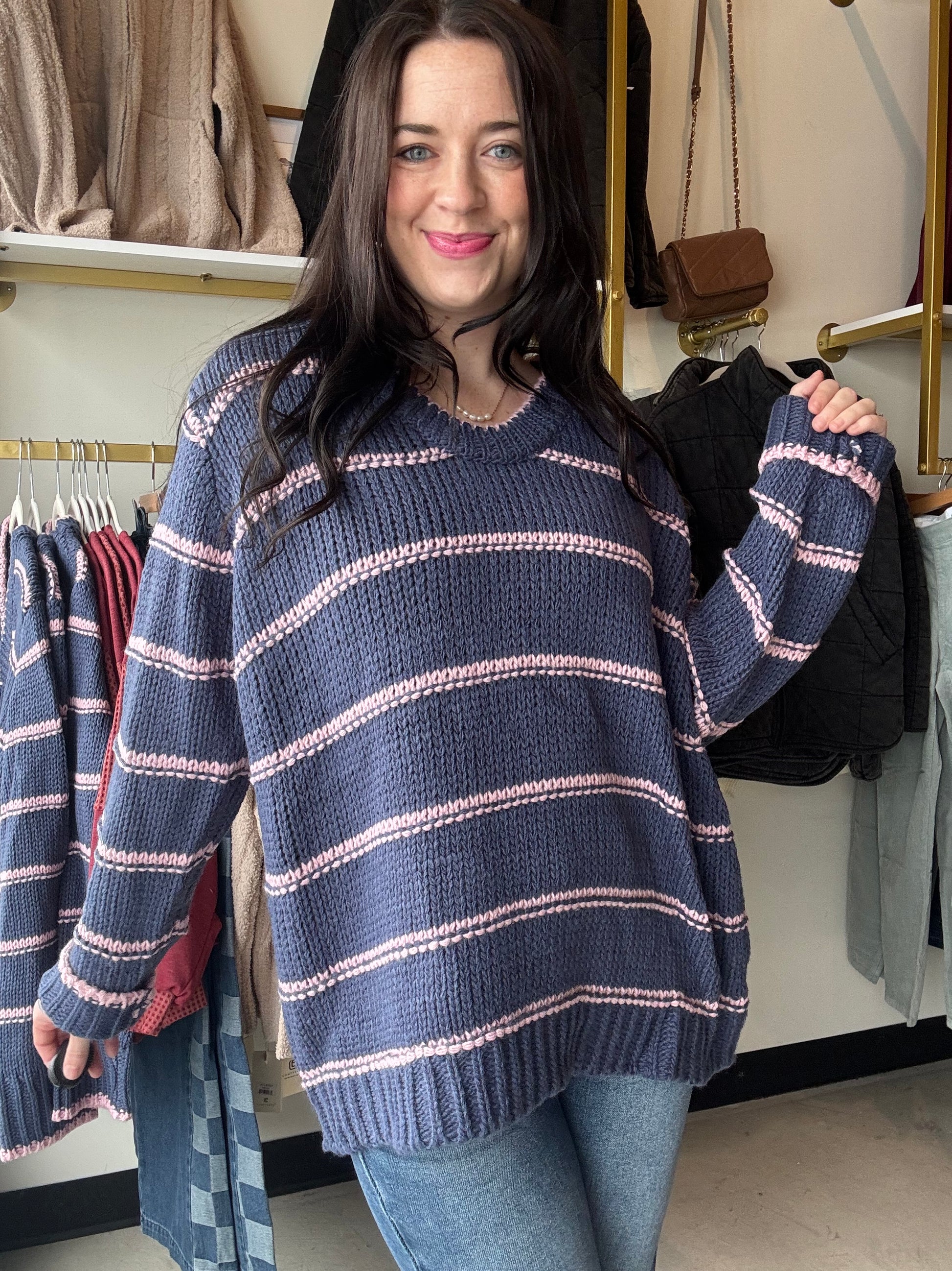 Layer this oversized striped knit sweater for effortless winter style. The soft pink and denim stripes create a timeless look that pairs with everything in your cold-weather rotation. Long sleeves and a relaxed fit make it ideal for cozy days from November through March. Versatile enough for casual outings or relaxed work settings, this piece becomes a go-to staple you'll reach for season after season.