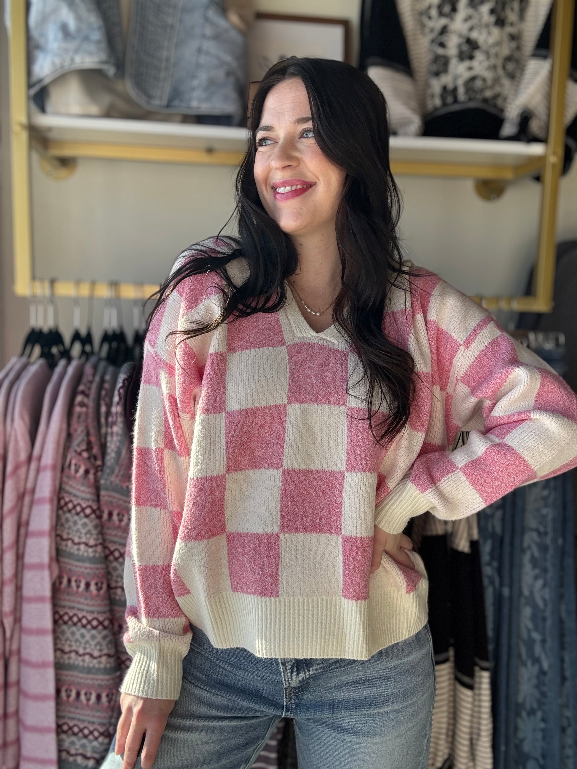 Wrap yourself in cozy spring vibes with this charming checkered hoodie! Featuring a classic pink and white pattern that's perfect for layering, this soft sweater keeps you comfortable whether you're running errands or relaxing at home. The crisp white cuffs and hem add a fresh, polished touch to the playful design. Lightweight enough for warmer days but warm enough for cool mornings—your new go-to piece for effortless style.