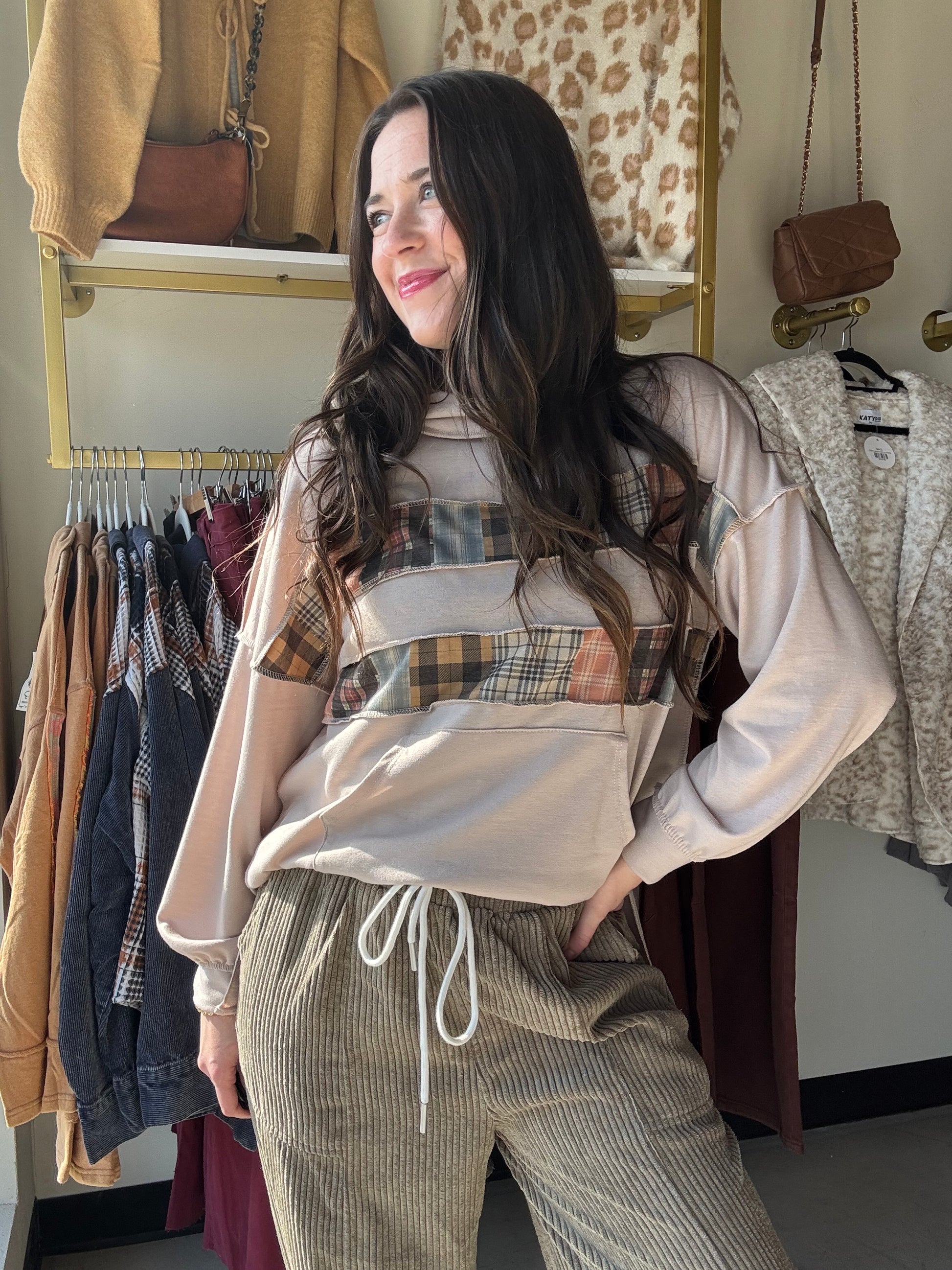 Get cozy in the Plaid Band Pullover Hoodie, your new go-to for effortless chill vibes. This oversized French terry knit features a wide, overlapped neckline and playful color block plaid, making comfort stylish. With side slits and a kangaroo pocket, it’s perfect for lounging or layering on cool days. Loose fit, long sleeves, and soft fabric combine for endless easygoing flair.