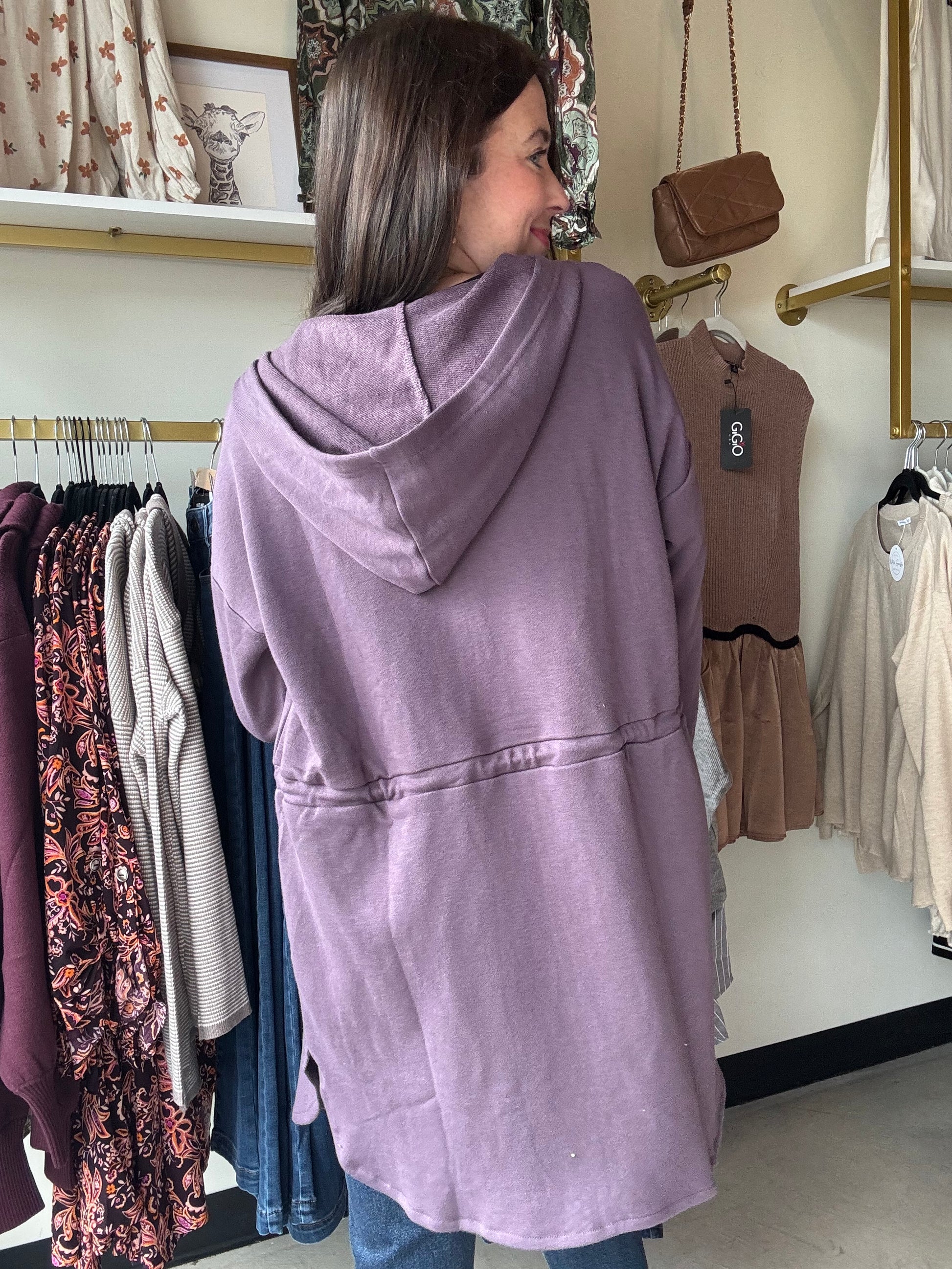 This Purple Tunic Zip Up Hoodie combines comfort and style with its French terry fabric, offering a soft yet durable feel. Designed with a drawstring waist for a customizable fit, it features long sleeves and a full zip front for versatility. The duster-length silhouette and hood add extra coverage and a modern edge, making it ideal for layering or casual wear.