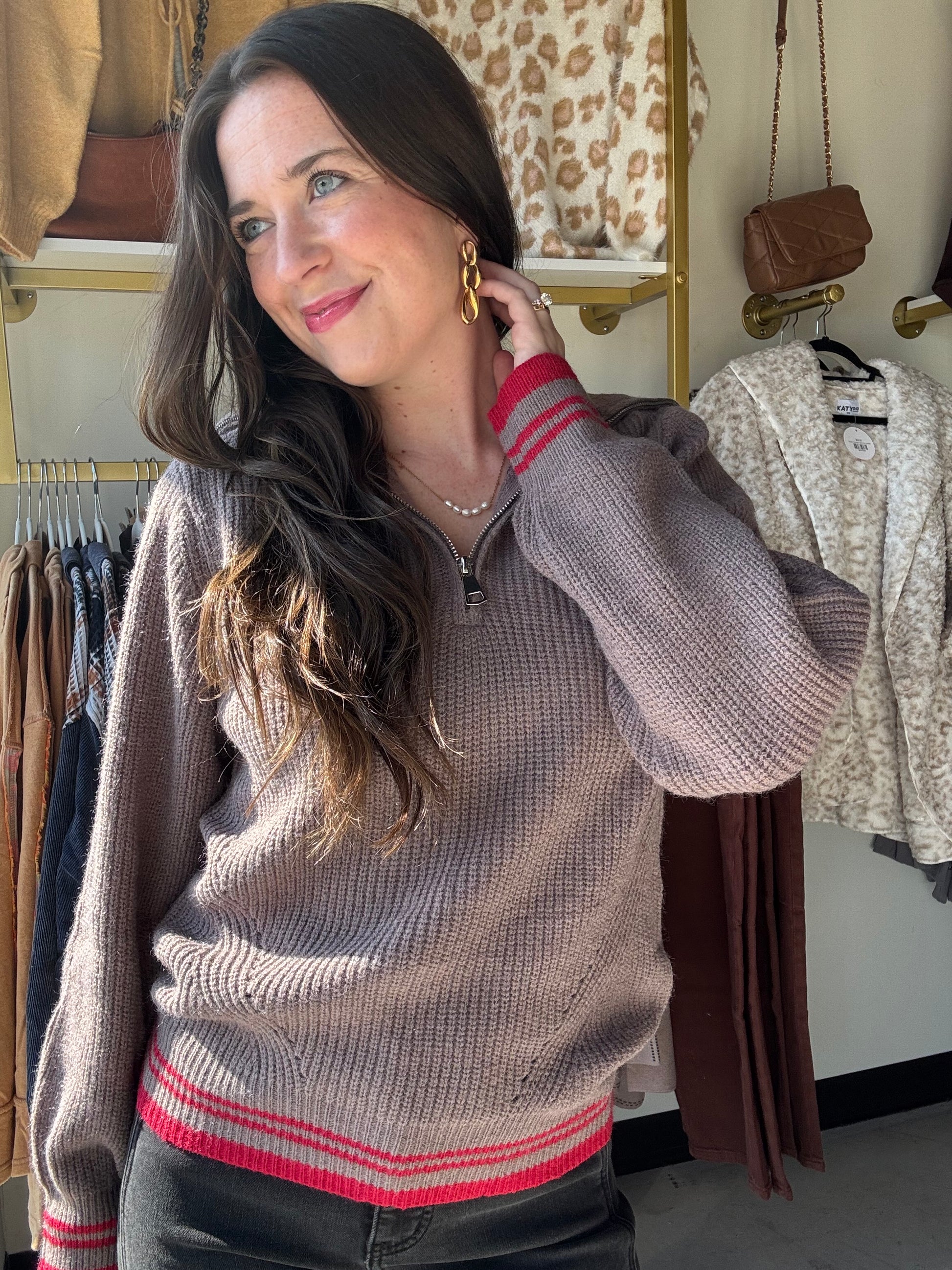 Stay cozy and stylish with the Red Accent Zip Up Pullover. Featuring a fun half-zip front and trendy wing collar neckline, this sweater brings relaxed comfort with dropped shoulders and a loose fit. Ribbed cuffs and hem with bold stripes add a playful pop, making it perfect for layering on cool days.