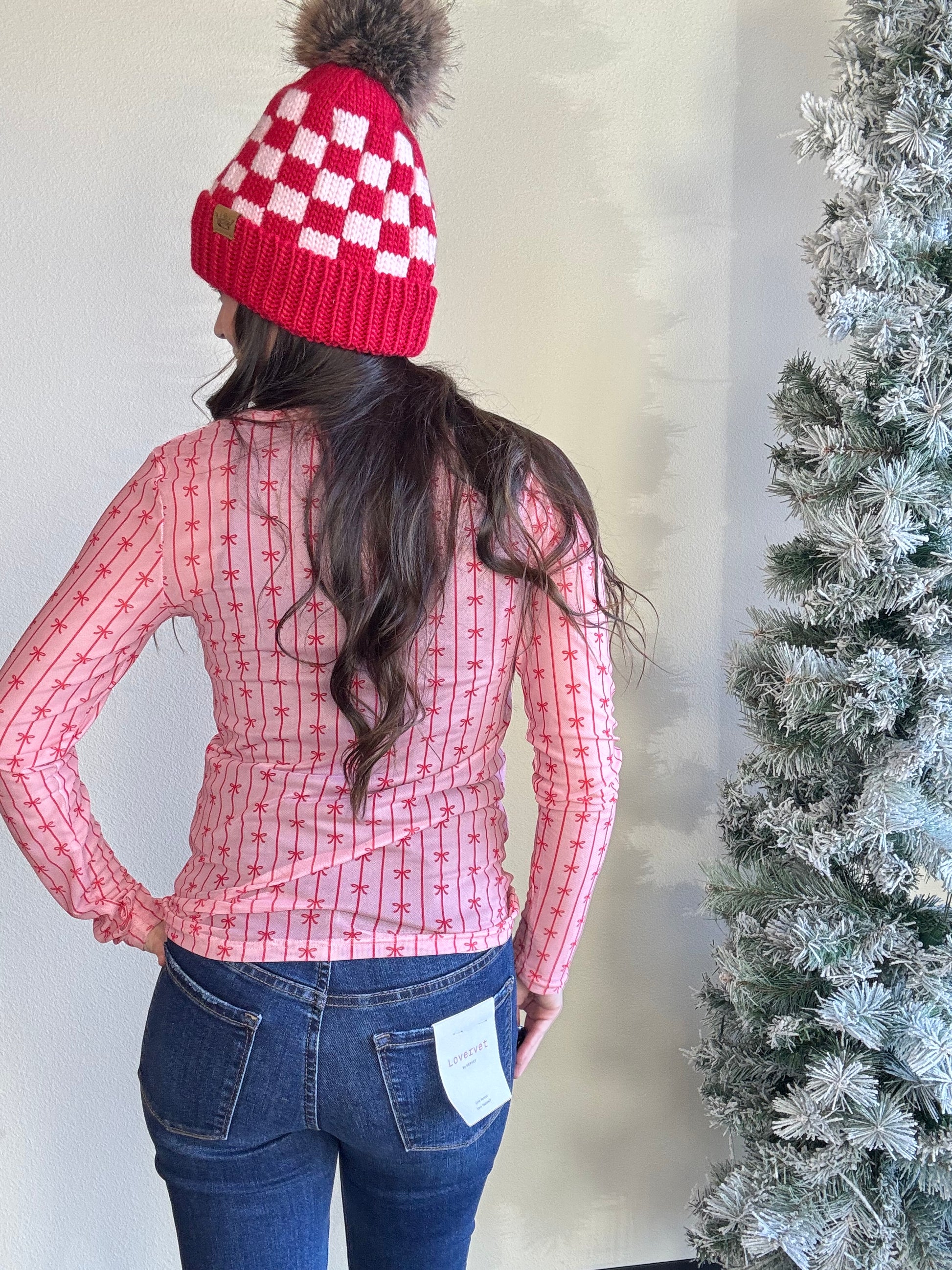 OUR HOLIDAY MESH PRINTS ARE HERE!! Super cute for layering, this sultry stretchy mesh print long-sleeve top, features a totally sheer design. Perfect worn alone or paired under your favorite cardigan, vest or sweater! Crew neck and thumbhole details.