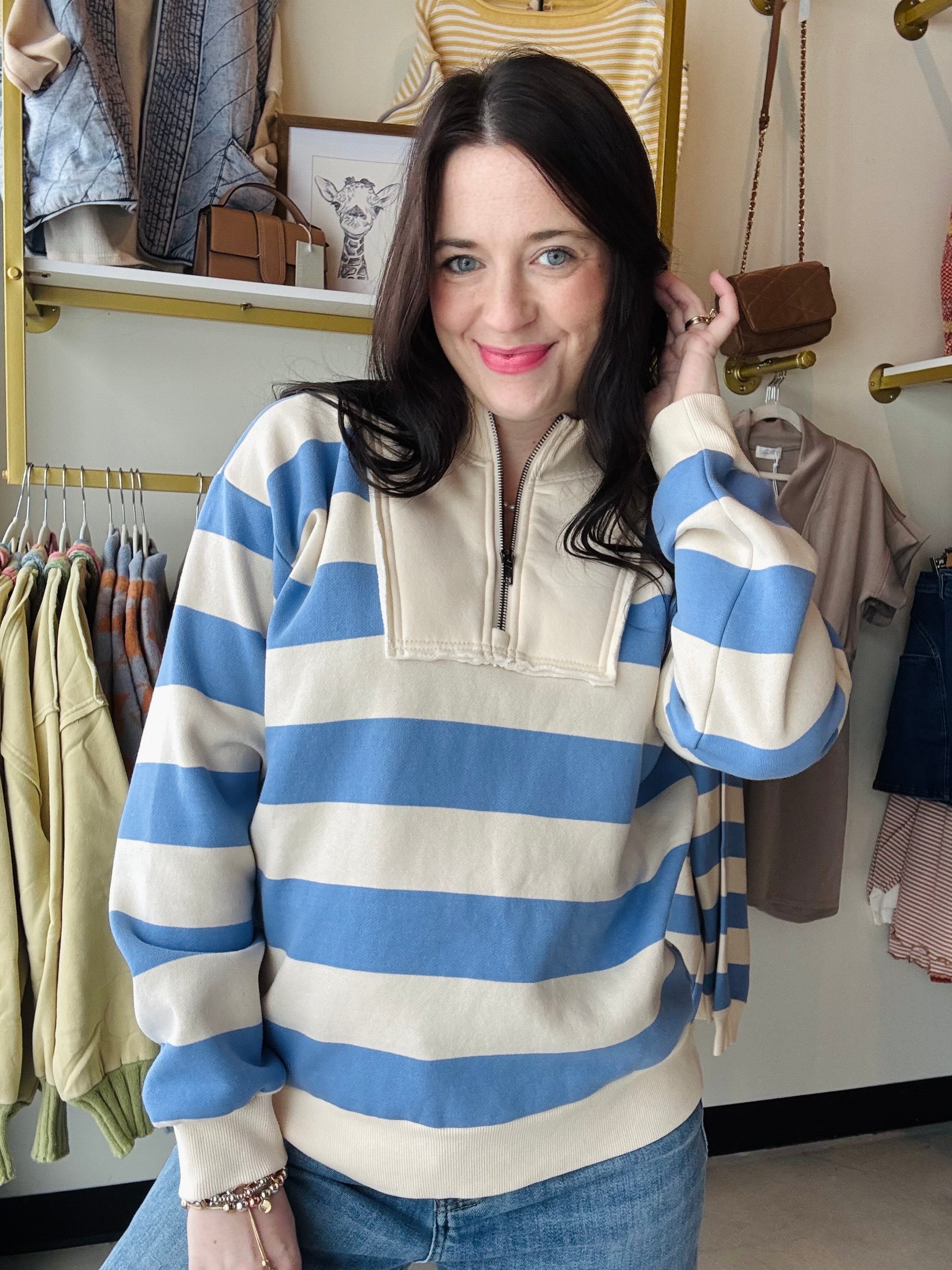 This versatile half-zip sweatshirt features classic ivory and blue wide stripes with a cozy fleece lining perfect for layering. The zip-up collar design offers easy adjustability for changing temperatures, while the French terry fabric provides a soft, breathable feel ideal for spring days. Whether you're heading out for a casual stroll or settling in at home, this striped essential pairs effortlessly with your favorite basics.