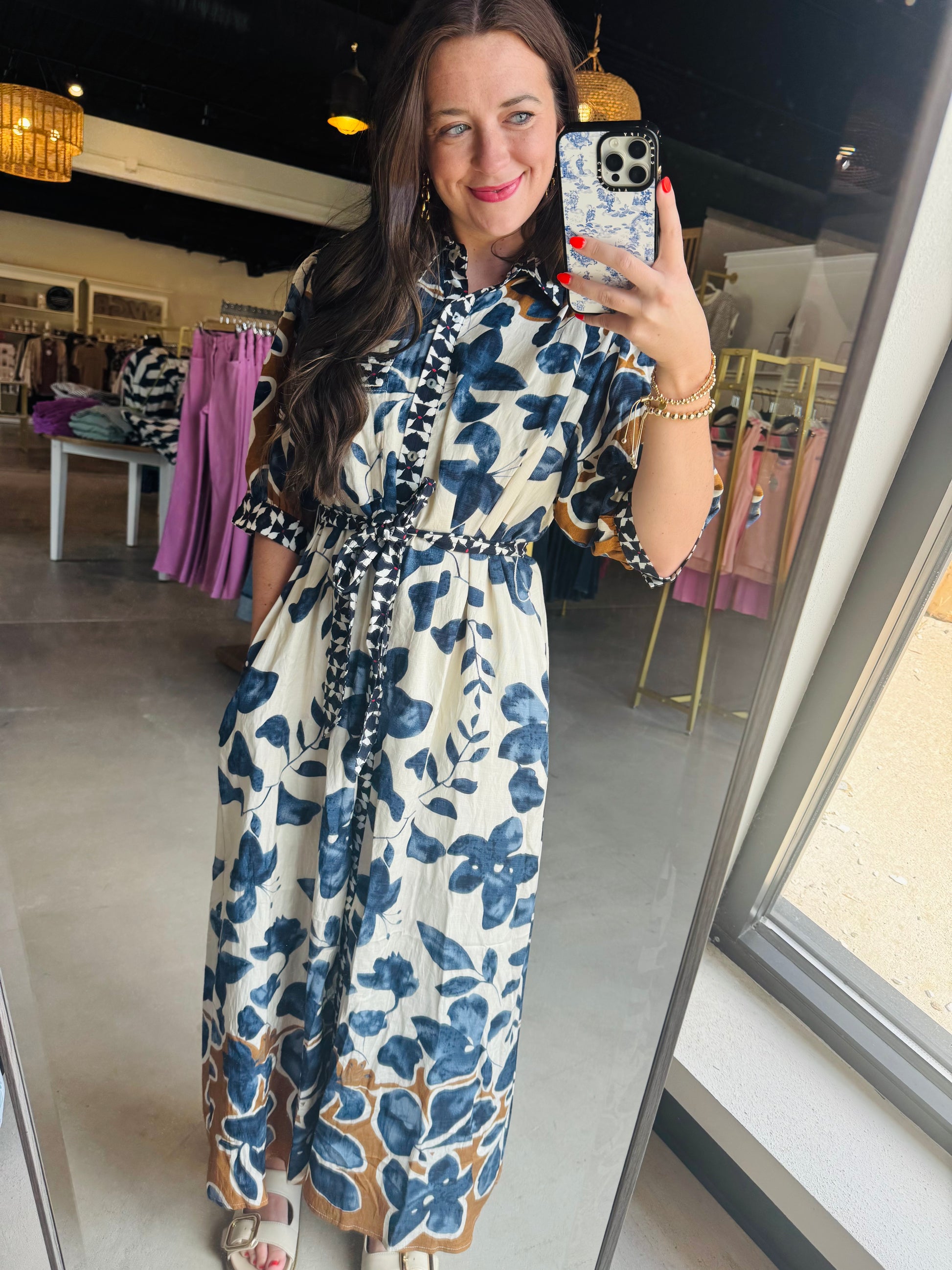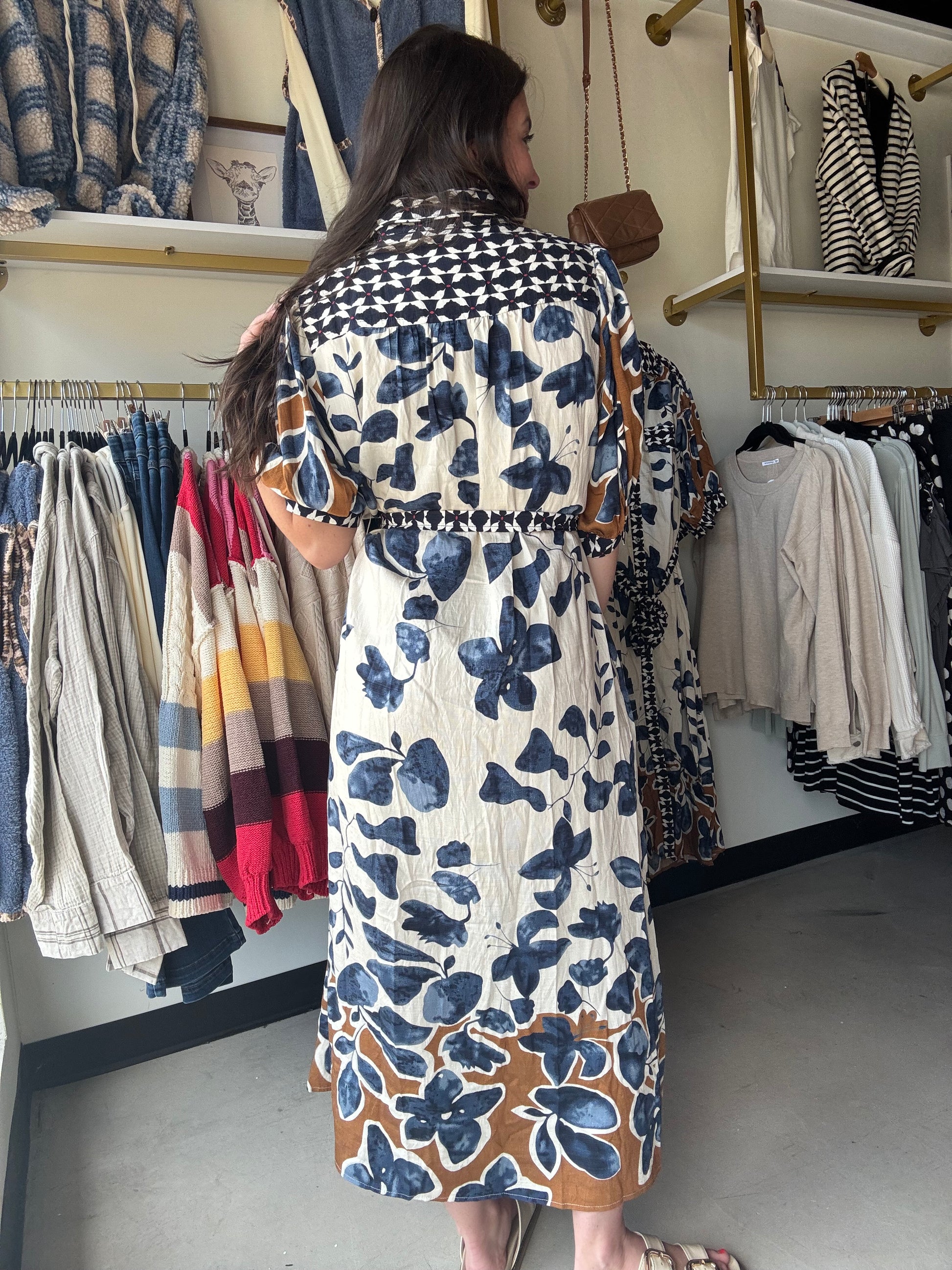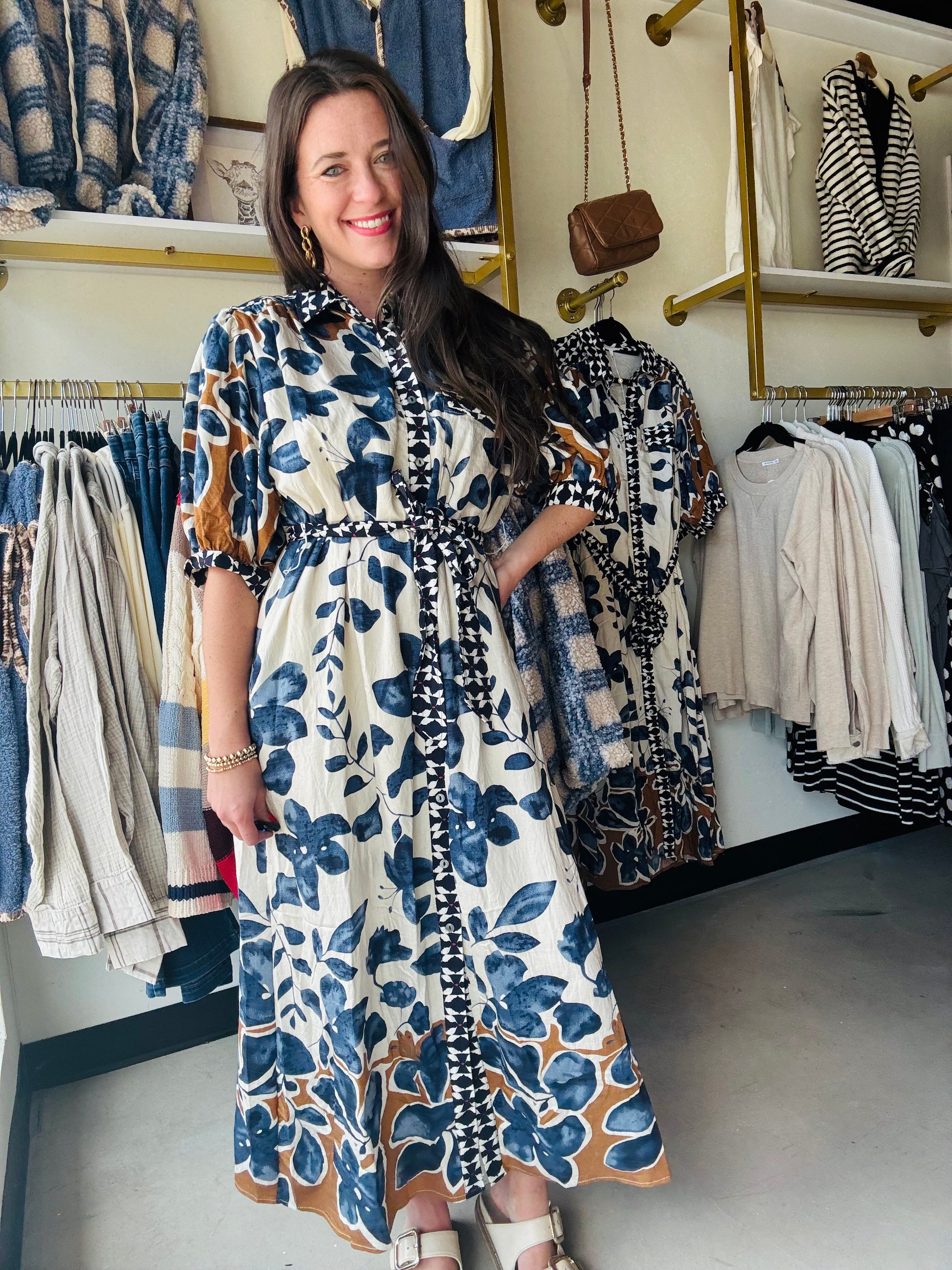 Bring a fresh twist to your wardrobe with the Slate & Mustard Button Dress. This playful ¾ sleeve midi dress features a lively botanical print, a bold abstract contrast band collar, and a button-front design for easy flair. Lightweight and lined, it offers comfort without the fuss, while side pockets add practicality. The removable belt lets you switch up your silhouette whenever you please, making it your go-to for effortless style all season long.
