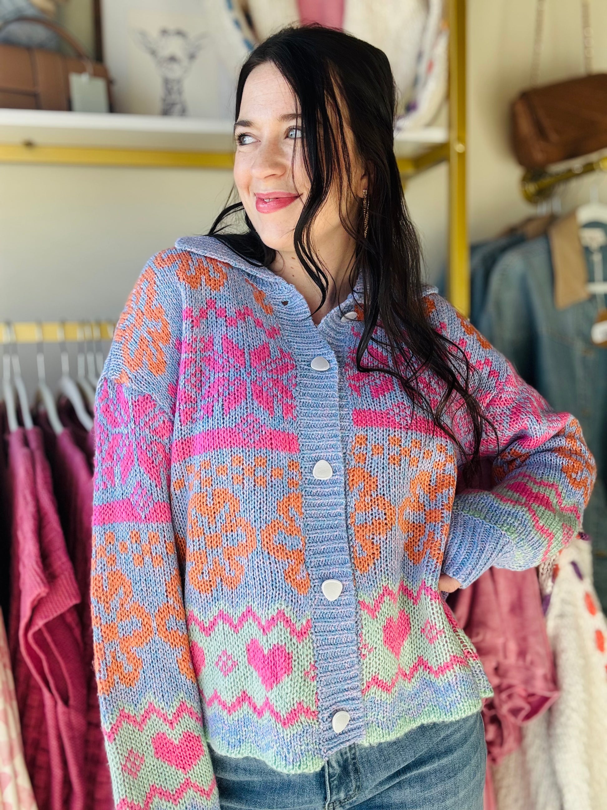 This relaxed knit sweater features a classic collar and drop shoulder silhouette for an effortlessly comfortable fit. The oversized button-down design pairs graphic detailing with long sleeves, making it perfect for layering or wearing solo. A versatile piece that transitions seamlessly from casual to polished looks.