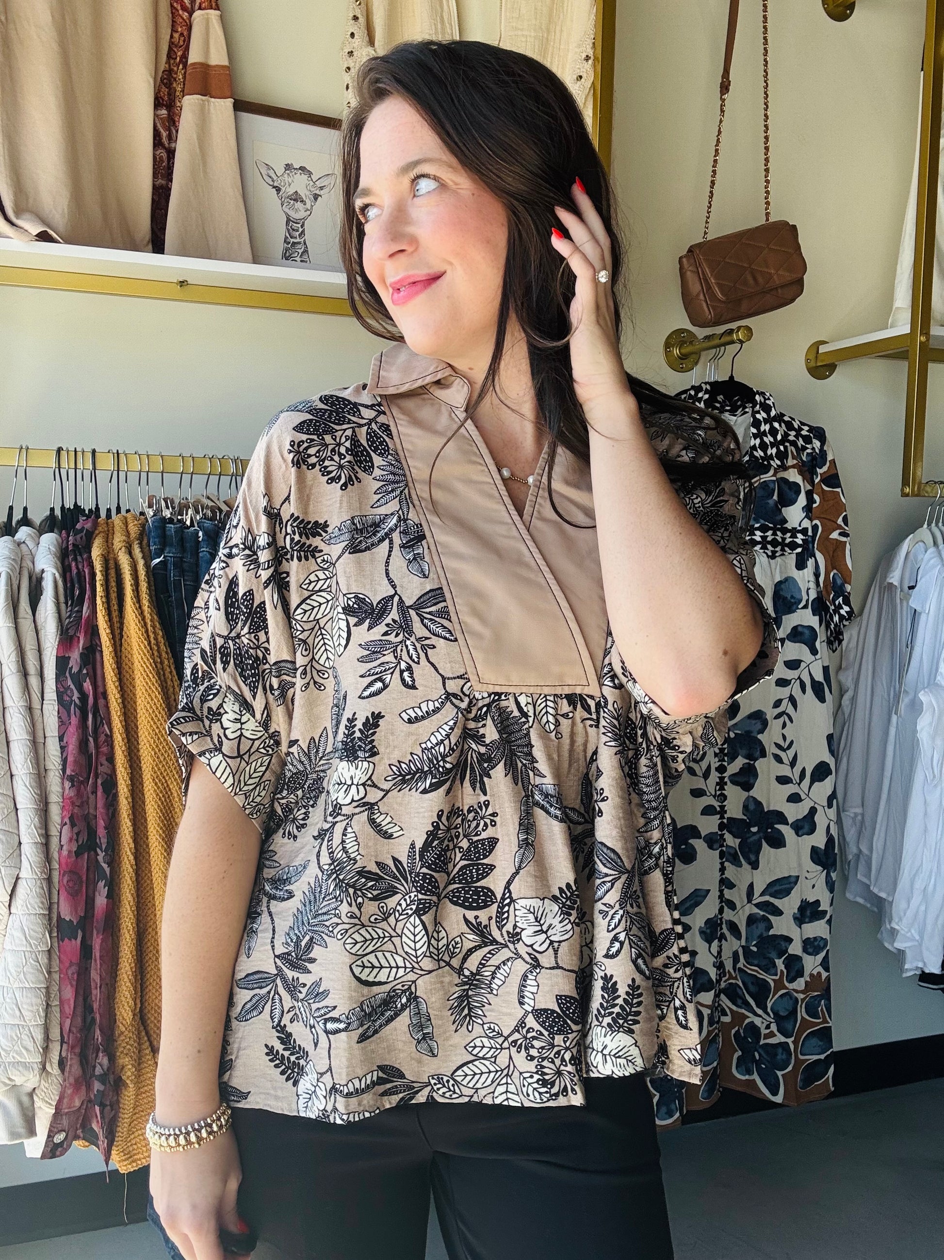 Embrace autumn vibes with this Taupe Foliage Motif Blouse, featuring a breezy 3/4 sleeve and a slight oversized fit for effortless style. Perfectly paired with your favorite denim, it’s a playful twist on fall fashion that keeps comfort front and center. Let the botanical print bring a fresh leaf to your wardrobe!