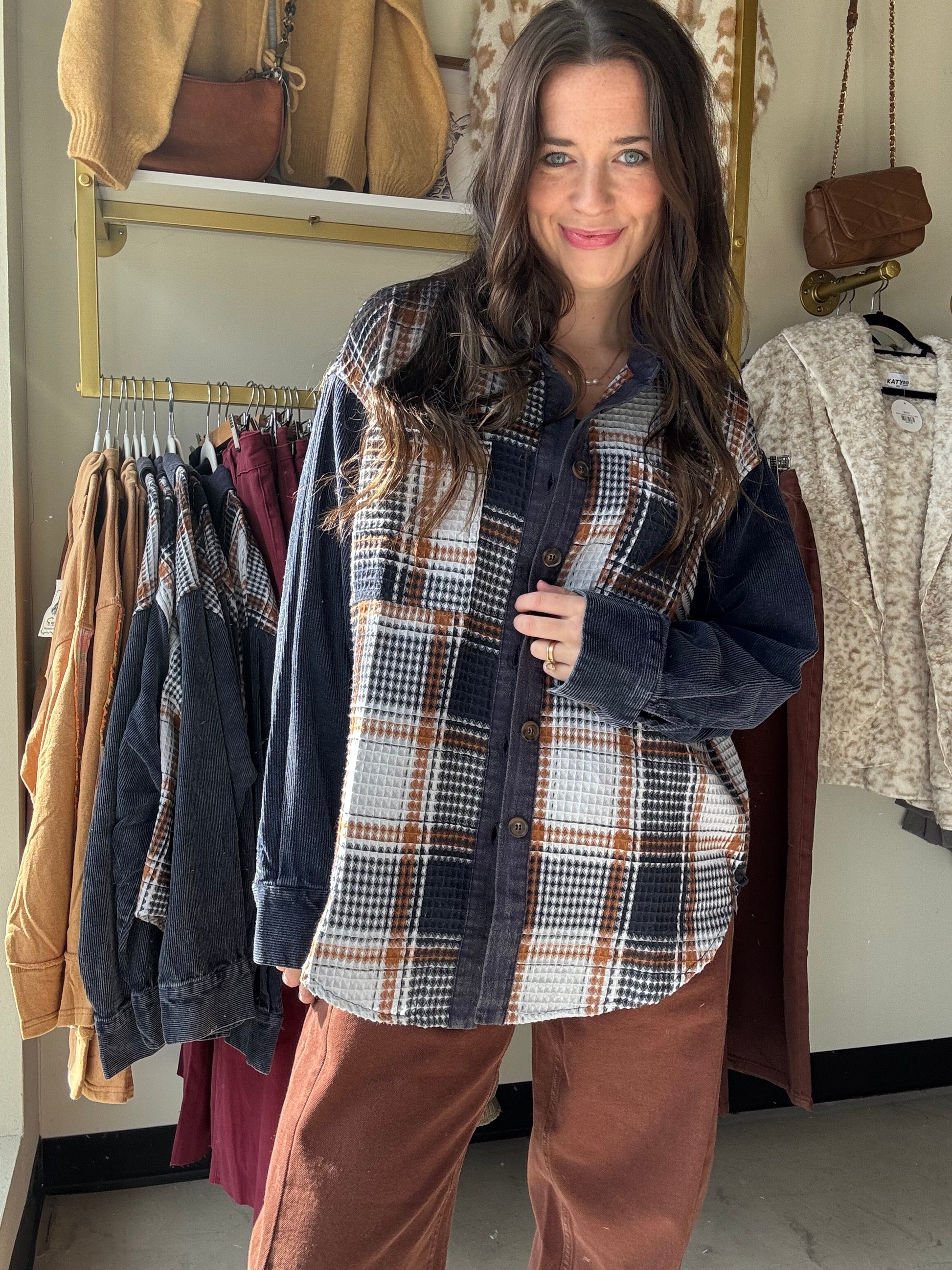 Cozy meets cool in this Waffle Plaid Mixed Shacket—a playful twist on layering! With soft waffle texture and classic plaid corduroy combined, it’s perfect for adding a pop of pattern and warmth to your outfit. Light enough for those in-between days but ready to snuggle up when it gets chilly. Embrace your fun side while staying effortlessly stylish!