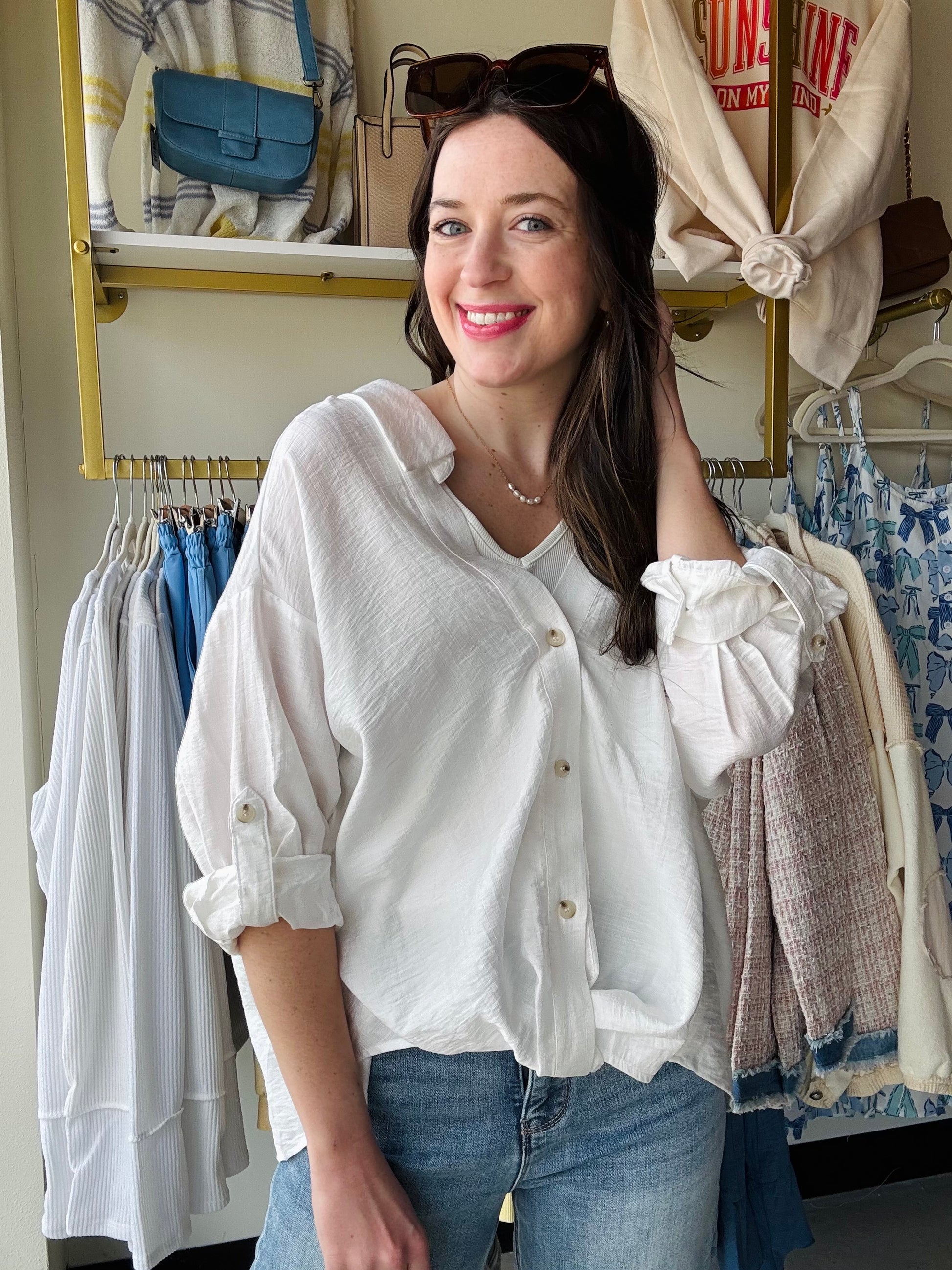 This woven blouse features a classic white color, rolled sleeves, and a V neckline for a sophisticated and timeless look. The front knot detail adds a touch of elegance to this wardrobe staple, making it the perfect choice for any professional or formal occasion.